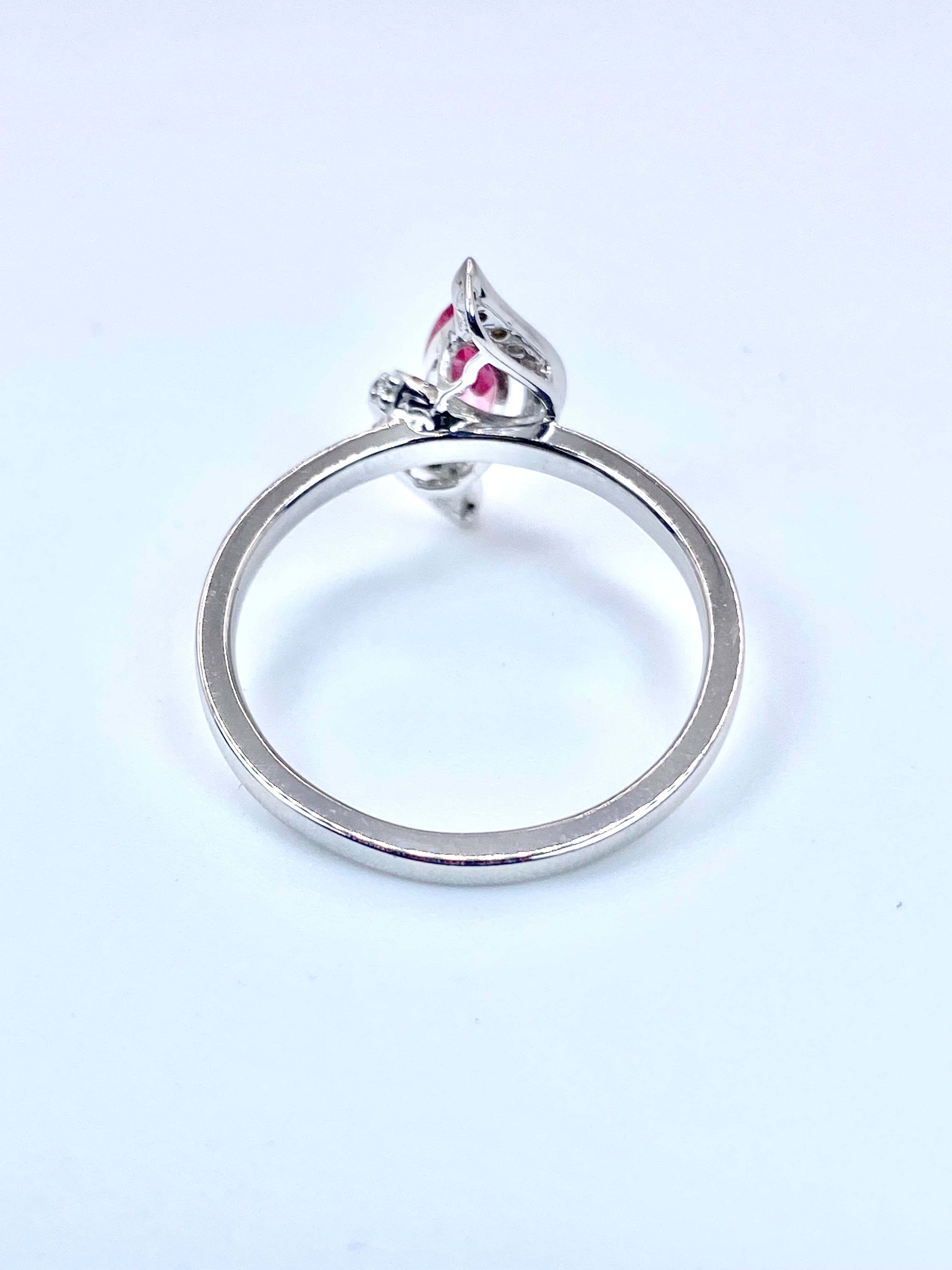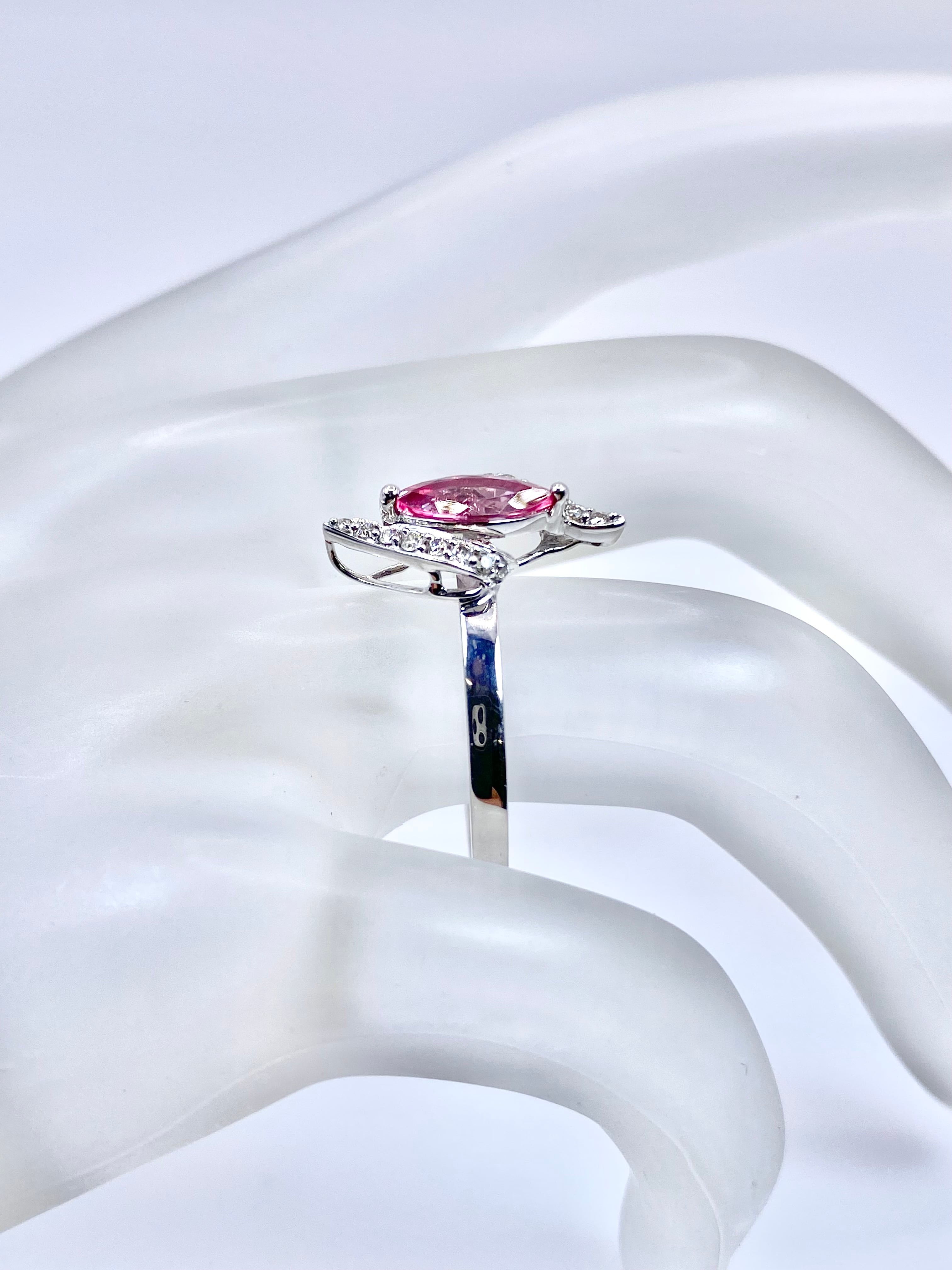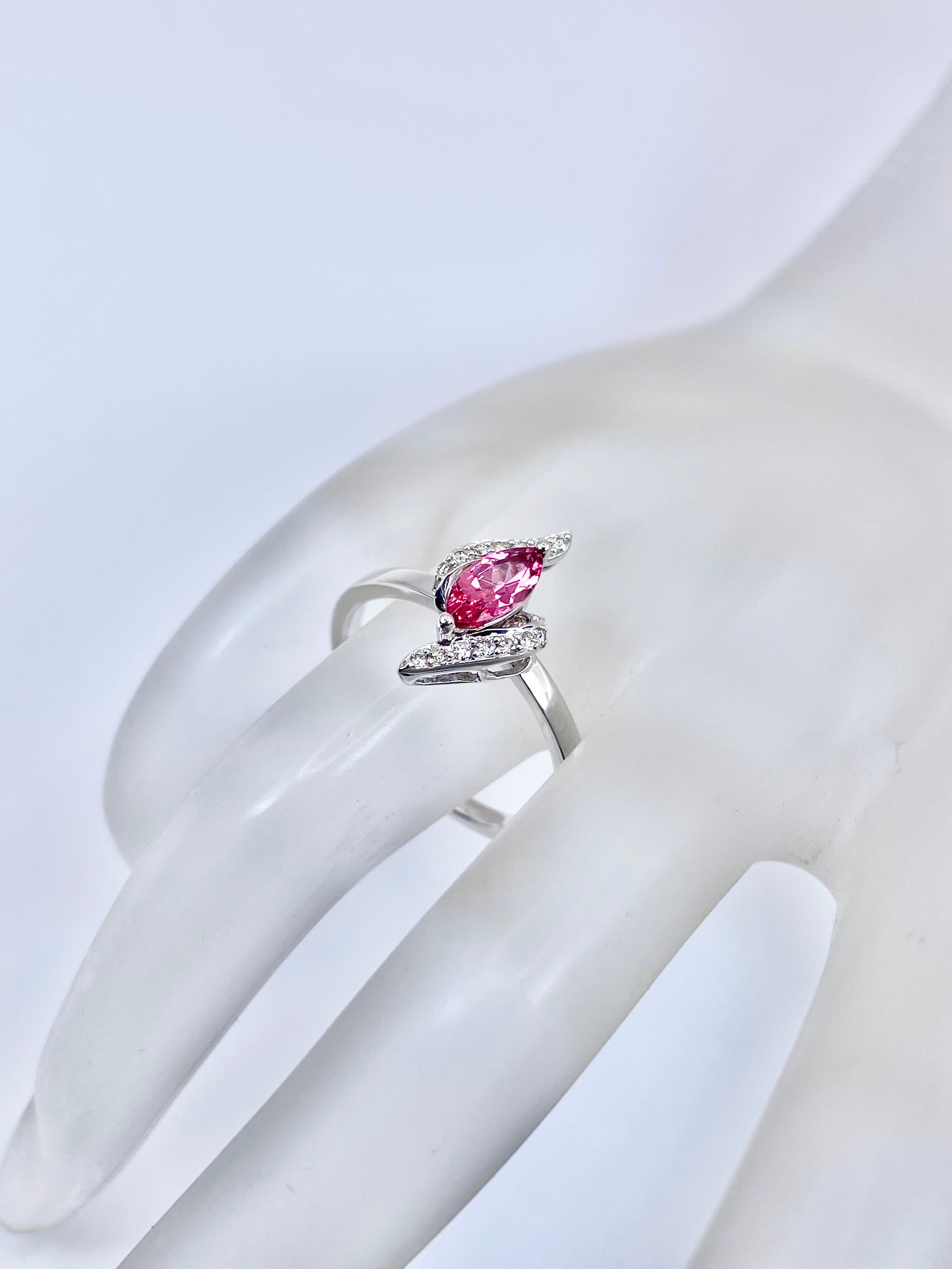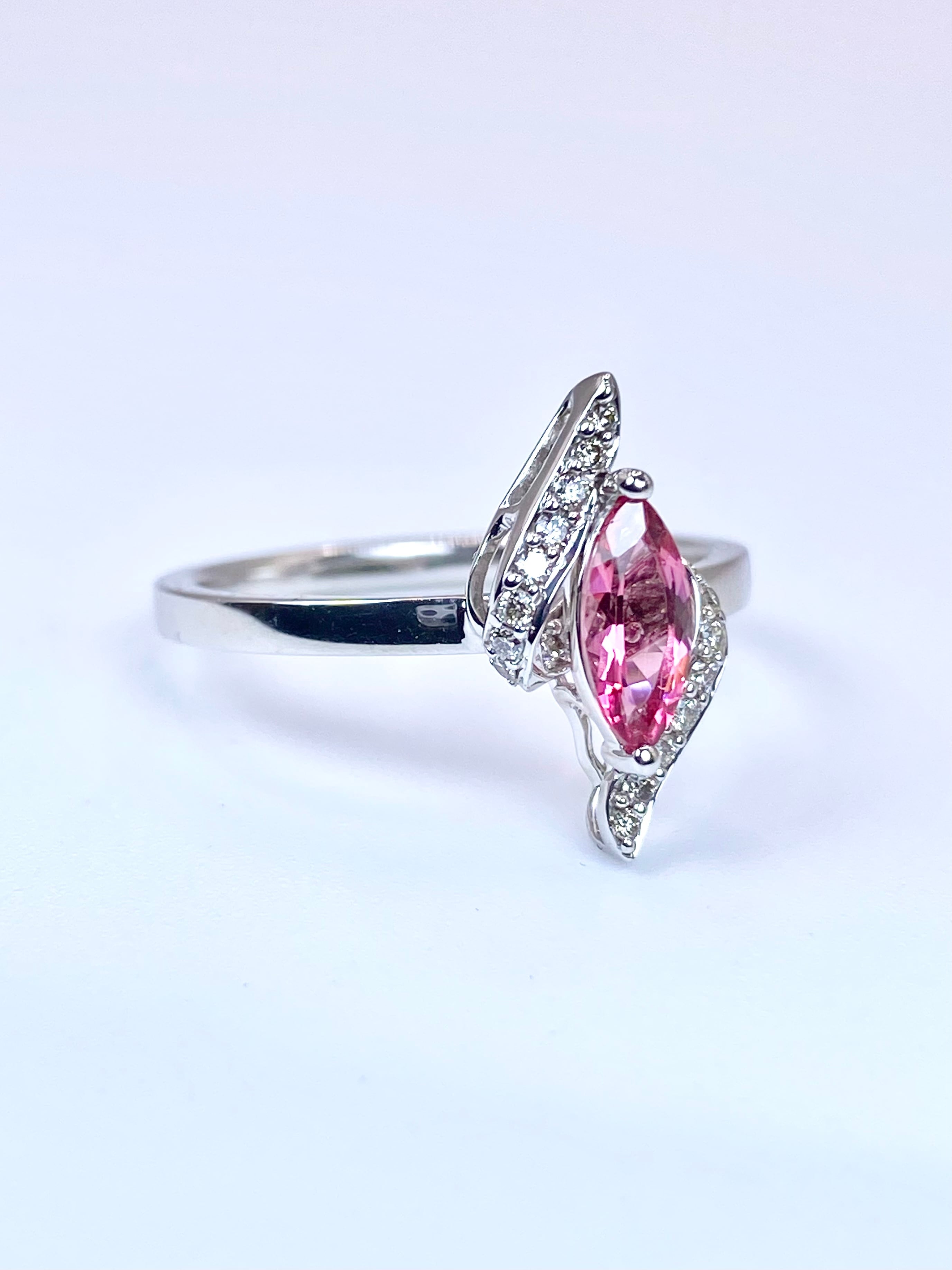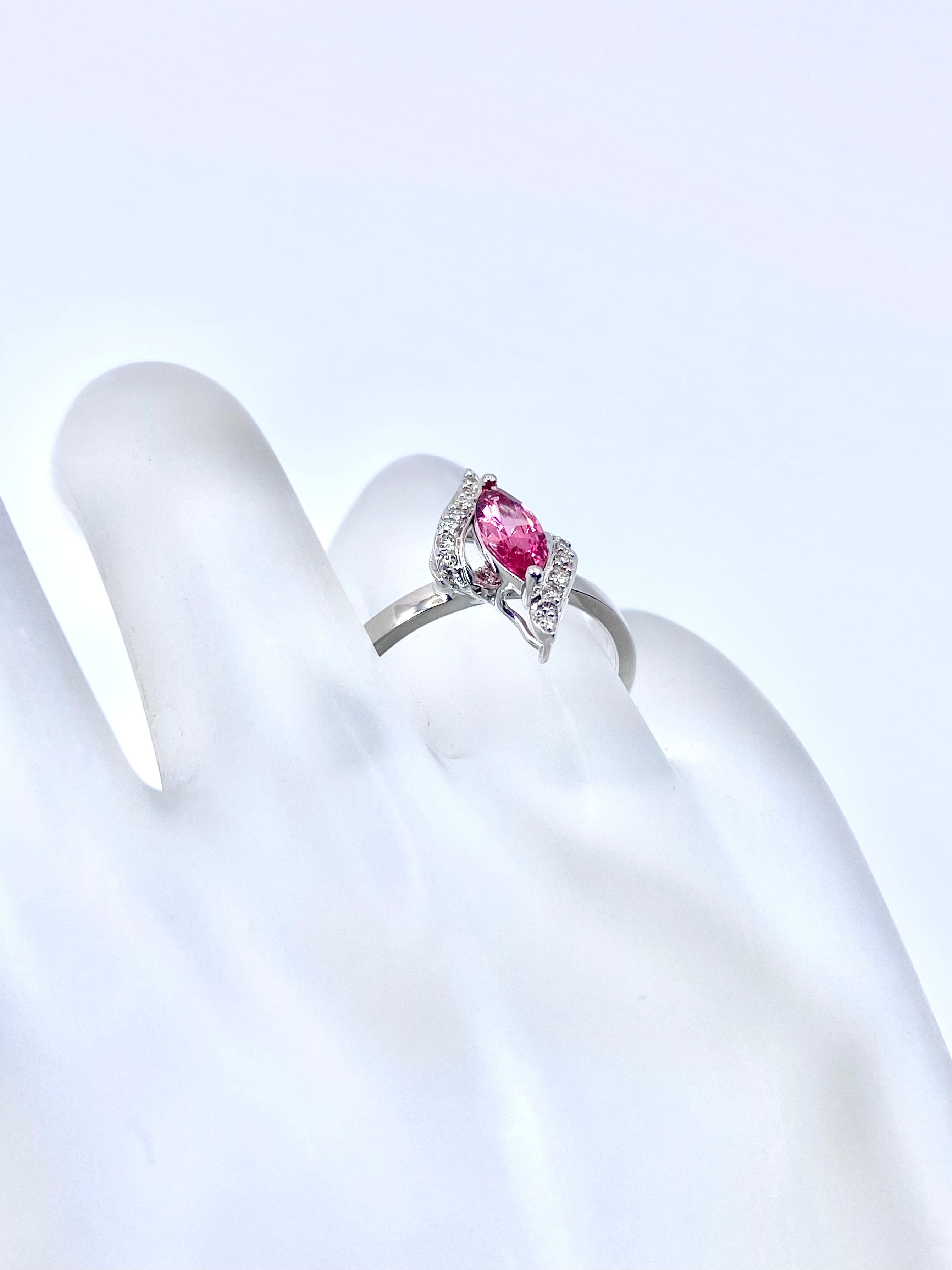 洗練された輝きを放つマーキースカットのスピネルを主役にした、18金ホワイトゴールドのリングのご紹介です。