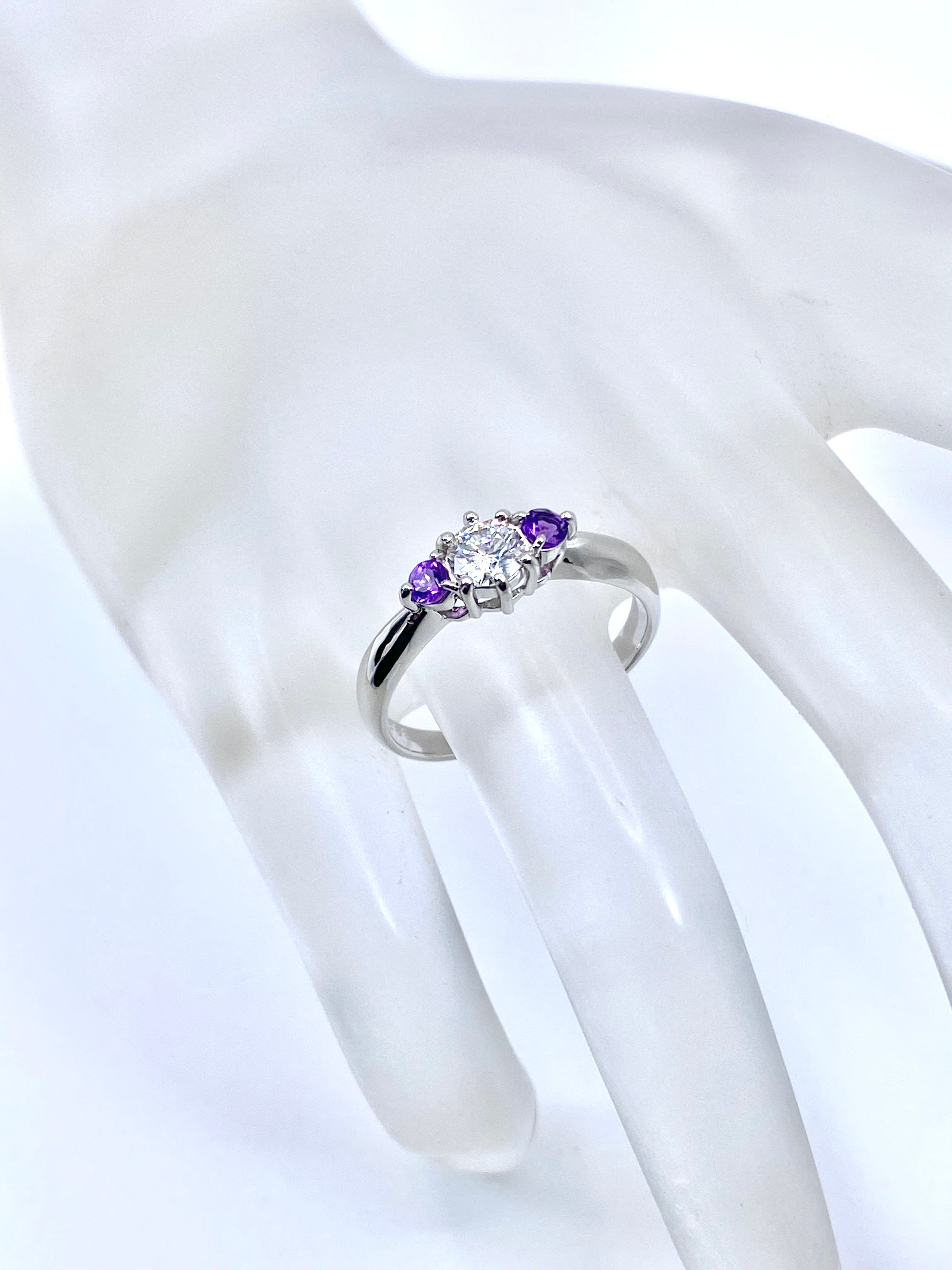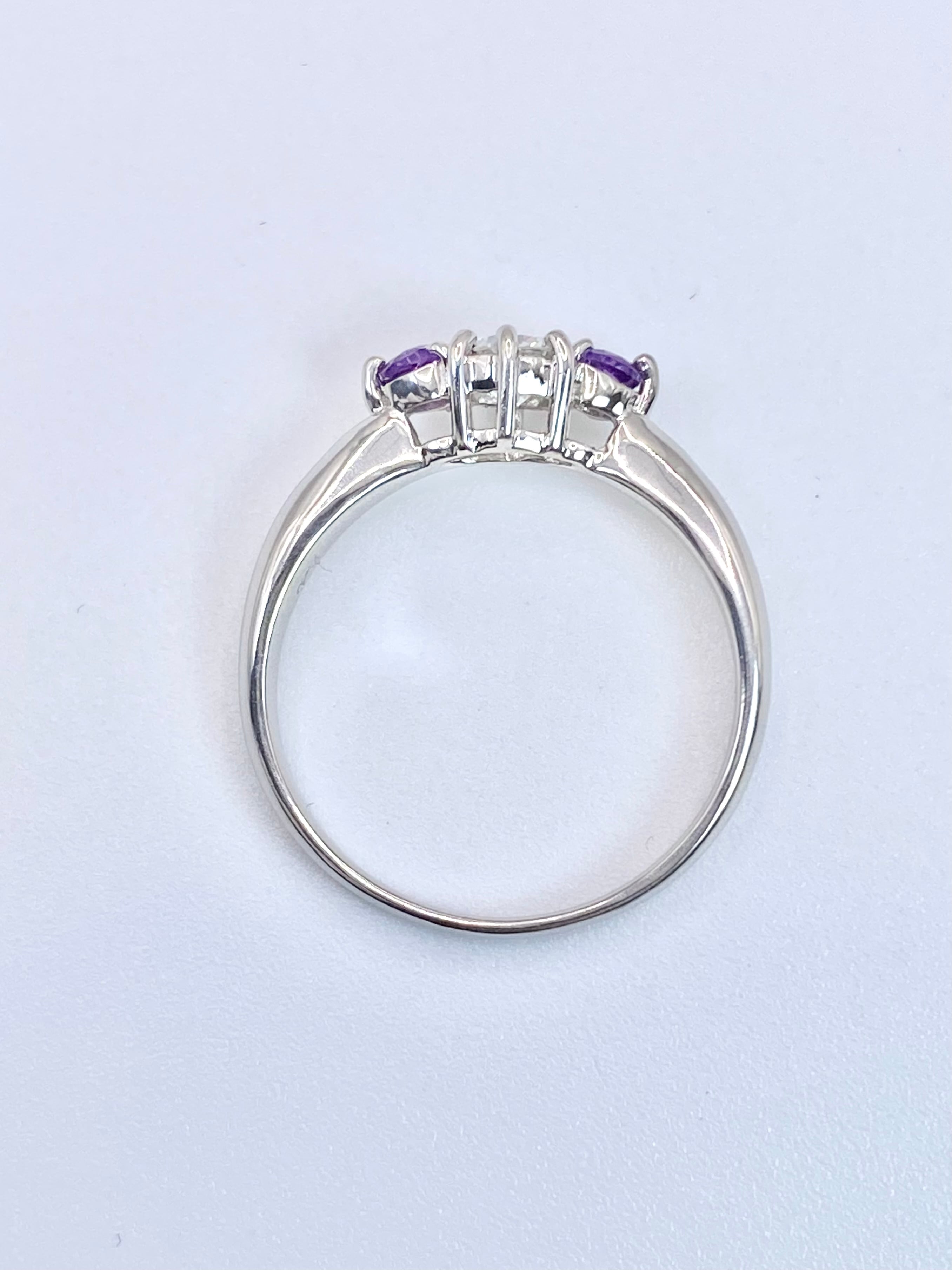 中石の両脇に小ぶりな脇石が1石ずつという、いわゆるよくある形のリングではありますが、その脇石がアメシストという点が少々ユニークなリングですね。