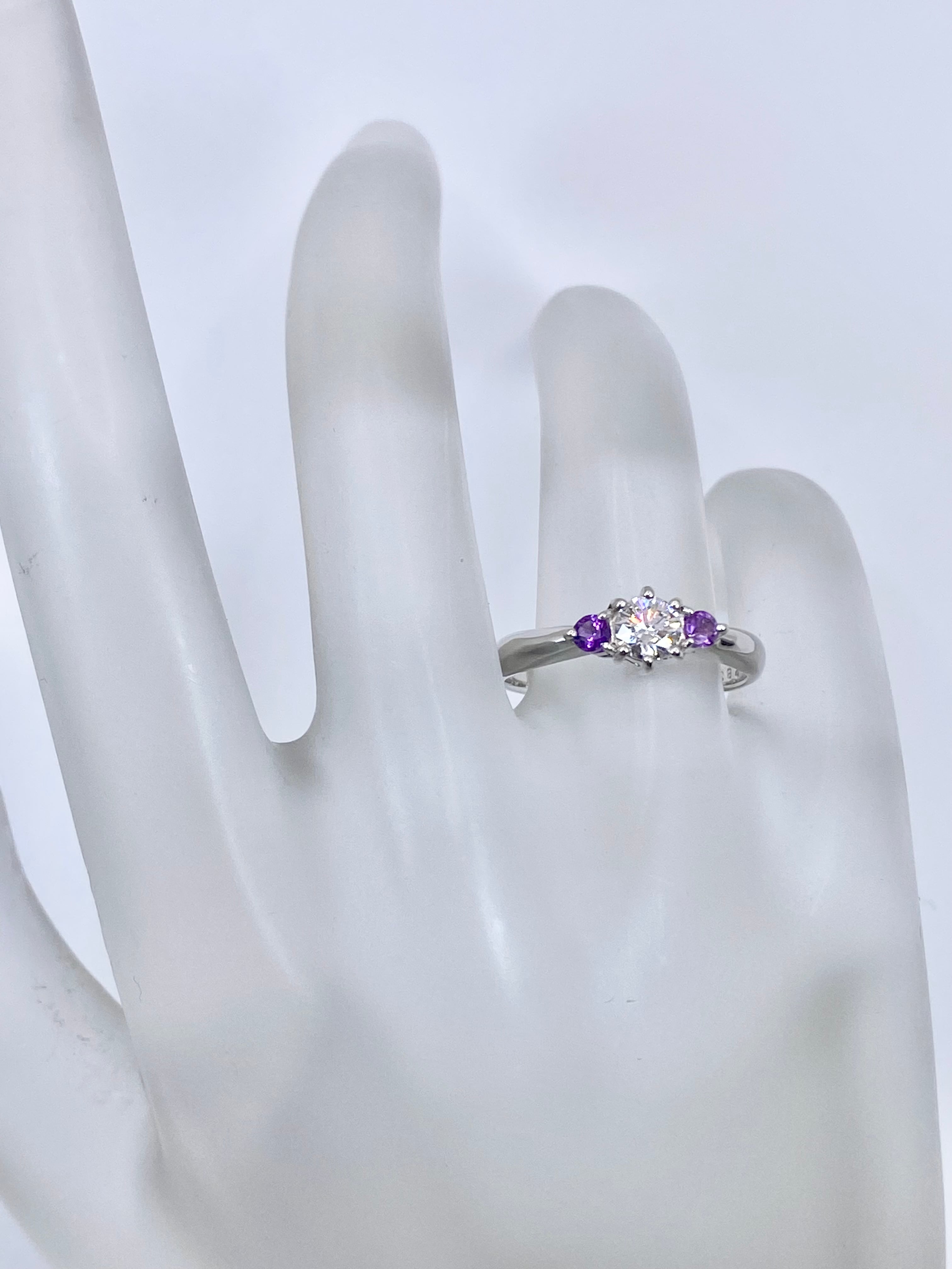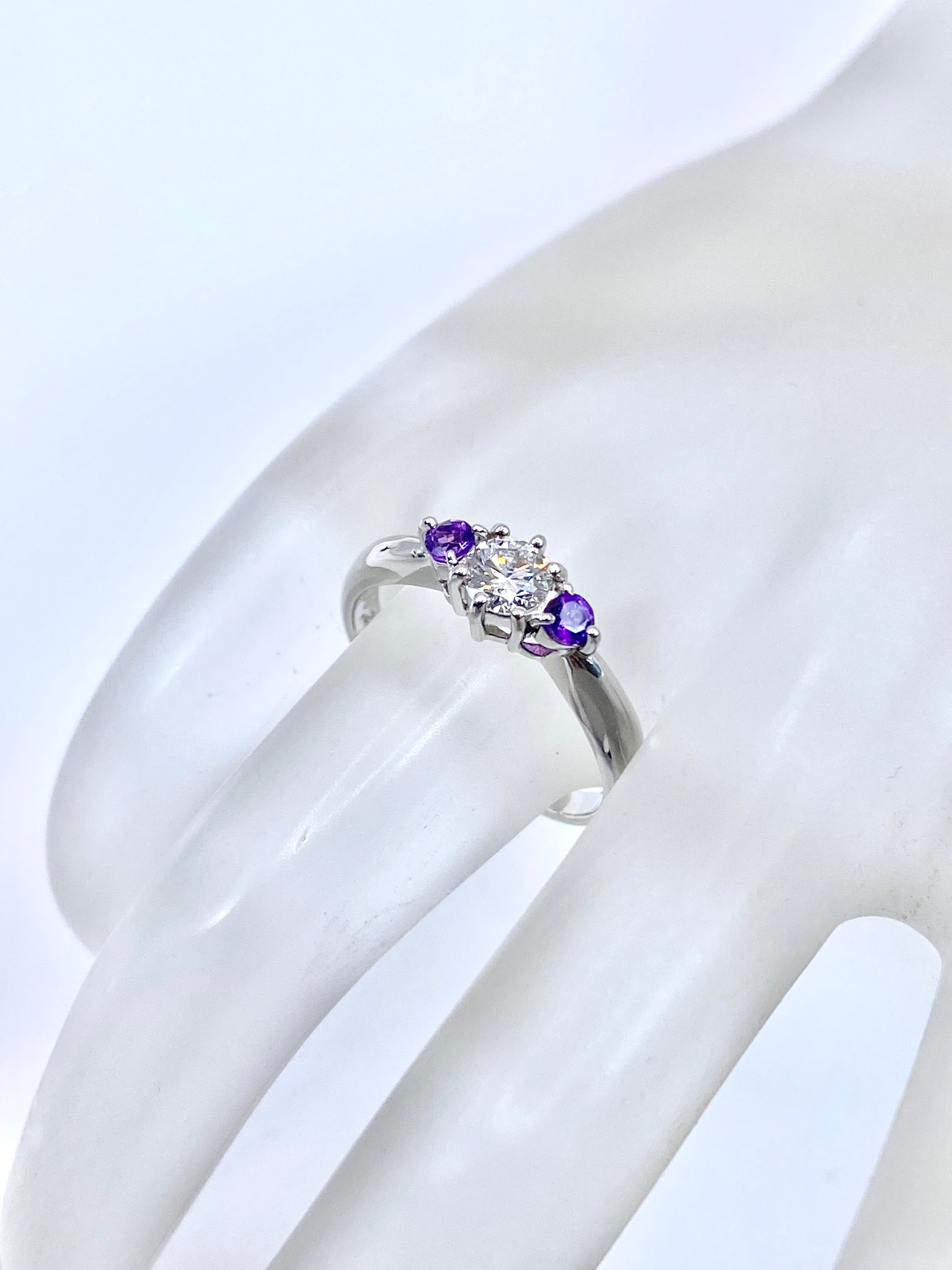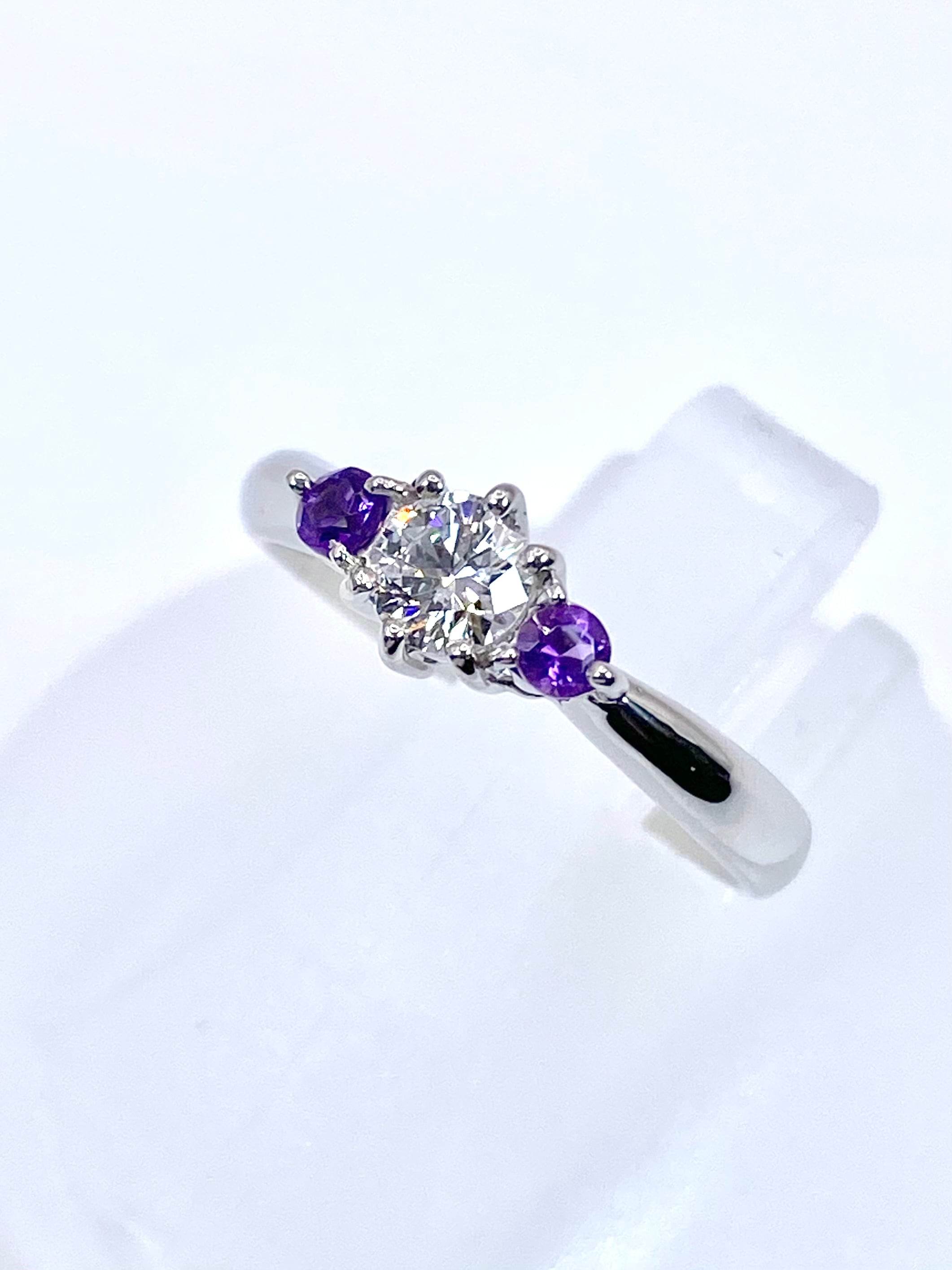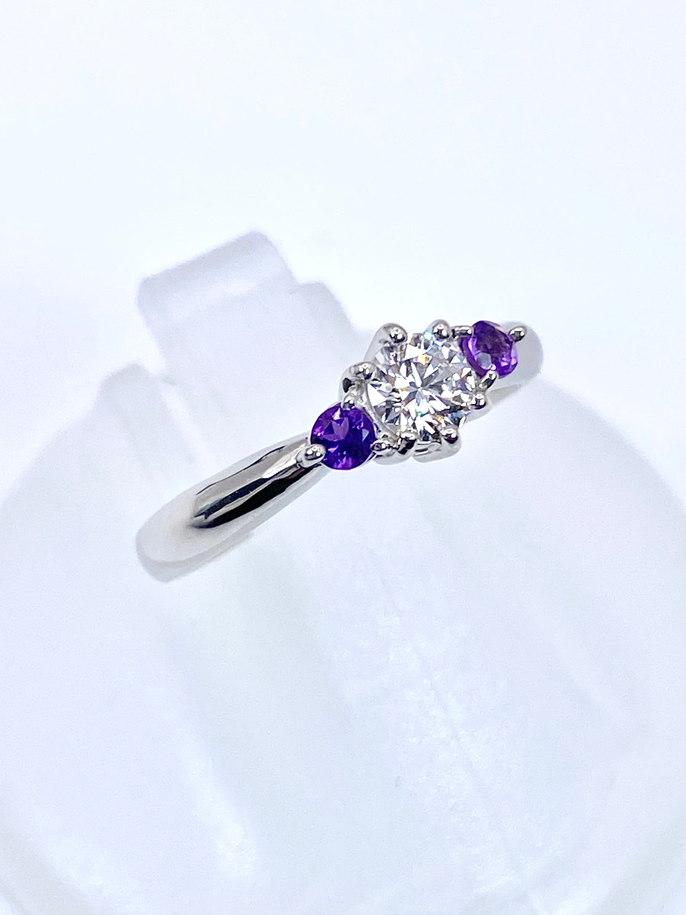 ダイヤモンド単体でも存在感十分のため、仮に脇石が無くとも見栄えのするリングとなったことと思いますが、「ダイヤモンドの脇石にアメシスト」という組み合わせによって、普通のスリーストーンリングとは少しだけ味付けの異なる、シンプルながらも意外性のある一品に仕上がっていますね。