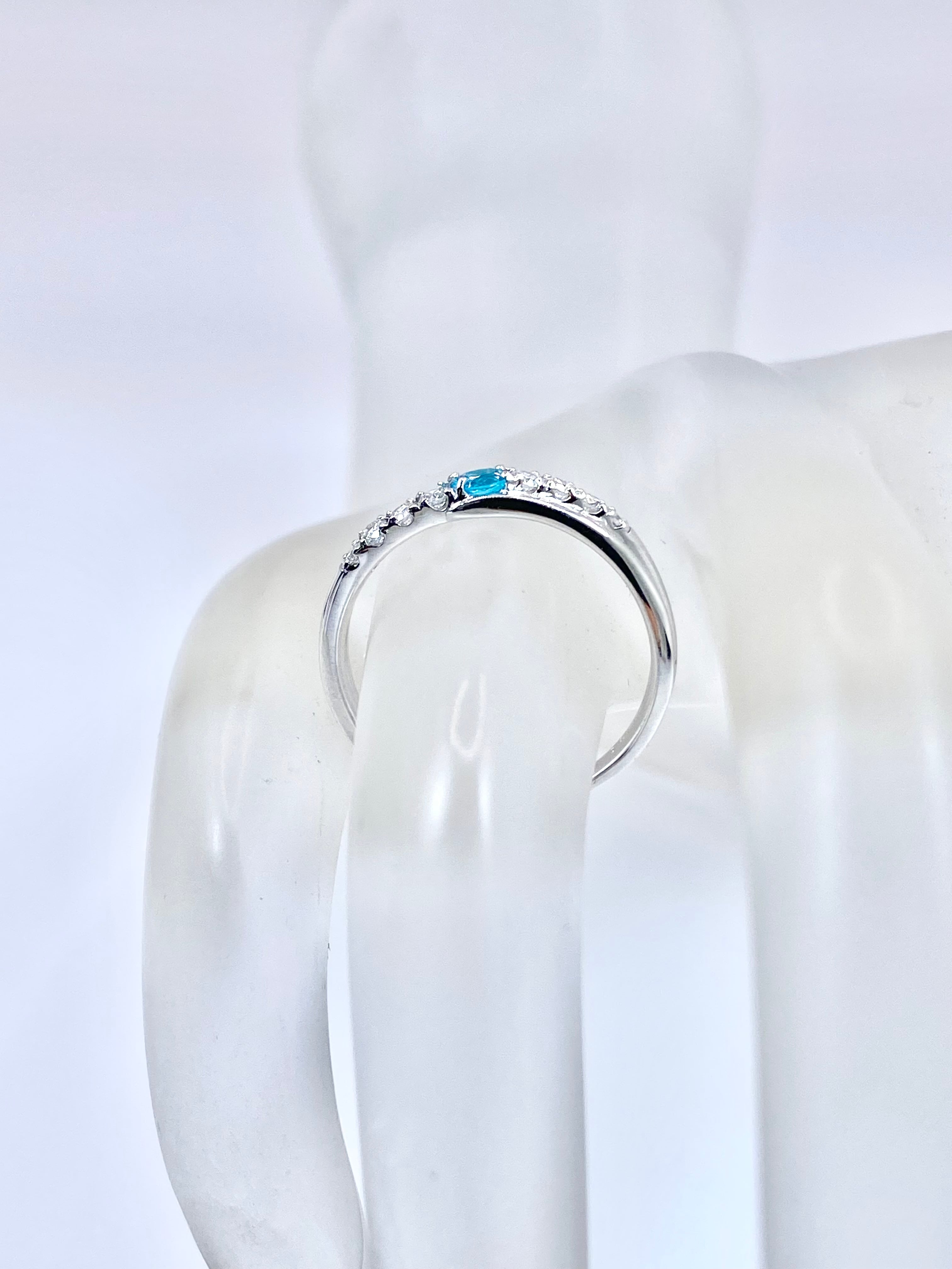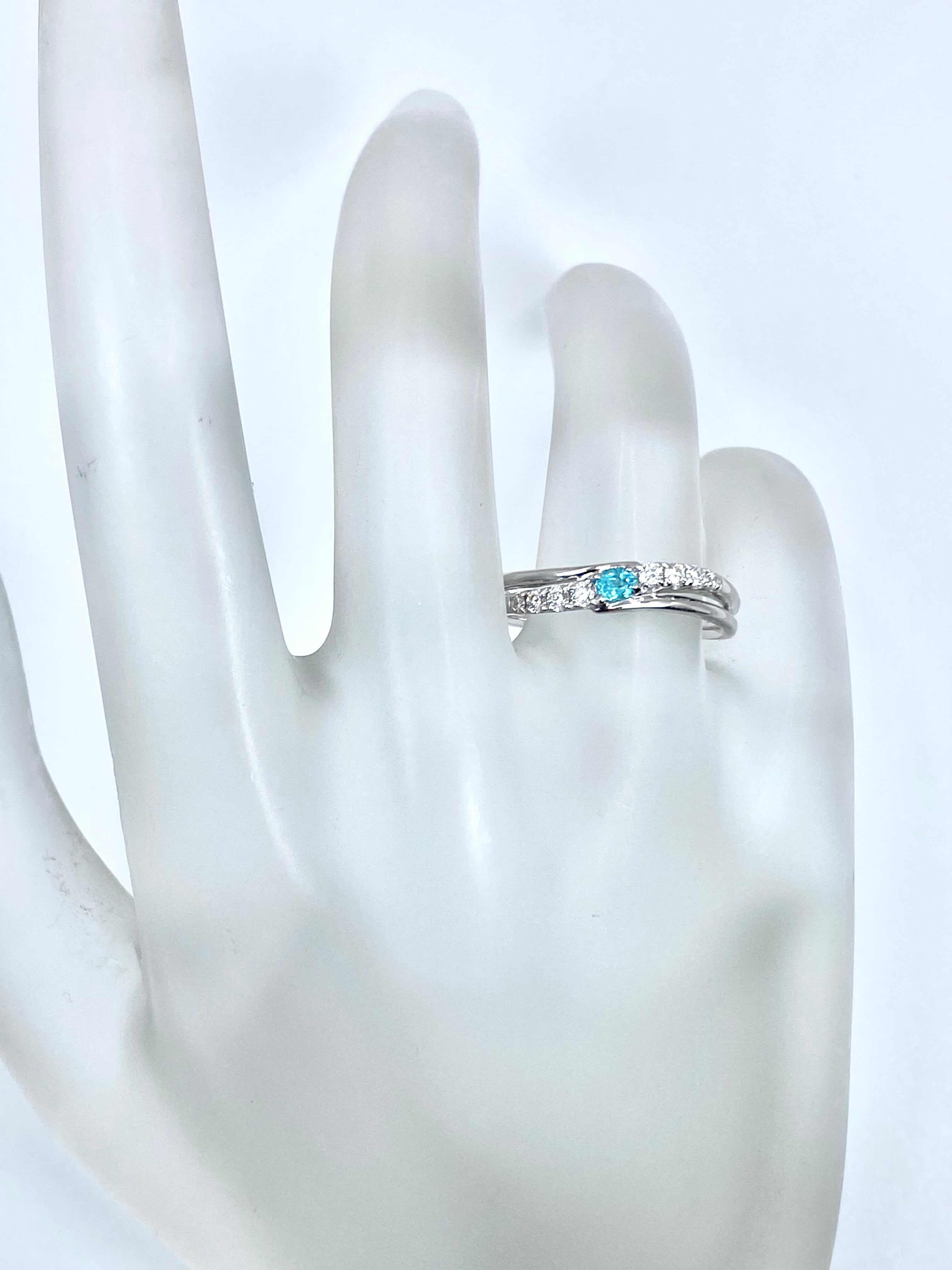 中石の両側に4ピースずつ留められたダイヤモンドも手抜かりが無く、それぞれは小粒ながらもはっきりときらめきます。パライバトルマリンの浅瀬のような色、そして少しウェーブがかった形状のリングも相まって、浜辺・さざ波・しぶき・・・を想起させますね。ほどよく幅もあり、またシンプルめながらも十分な輝きを纏っており、全体的にバランスの取れた、長きに渡って身に着けられる一品かと思います。