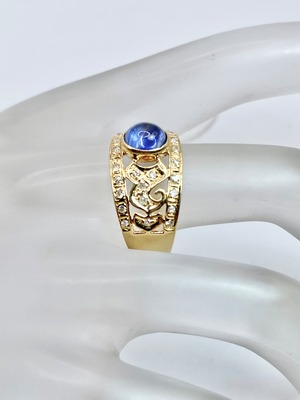 そんなお淑やかな様子のサファイアに対し、リングは中々に豪華です。上部は紋章のような透かしとなっており、加えて全体にダイヤモンドが散りばめられております。金枠かつ幅が広めということもあって絢爛な雰囲気があり、仮に中石が無かったとしてもお手元を一気に華やいだ雰囲気にしてくれることと思います。