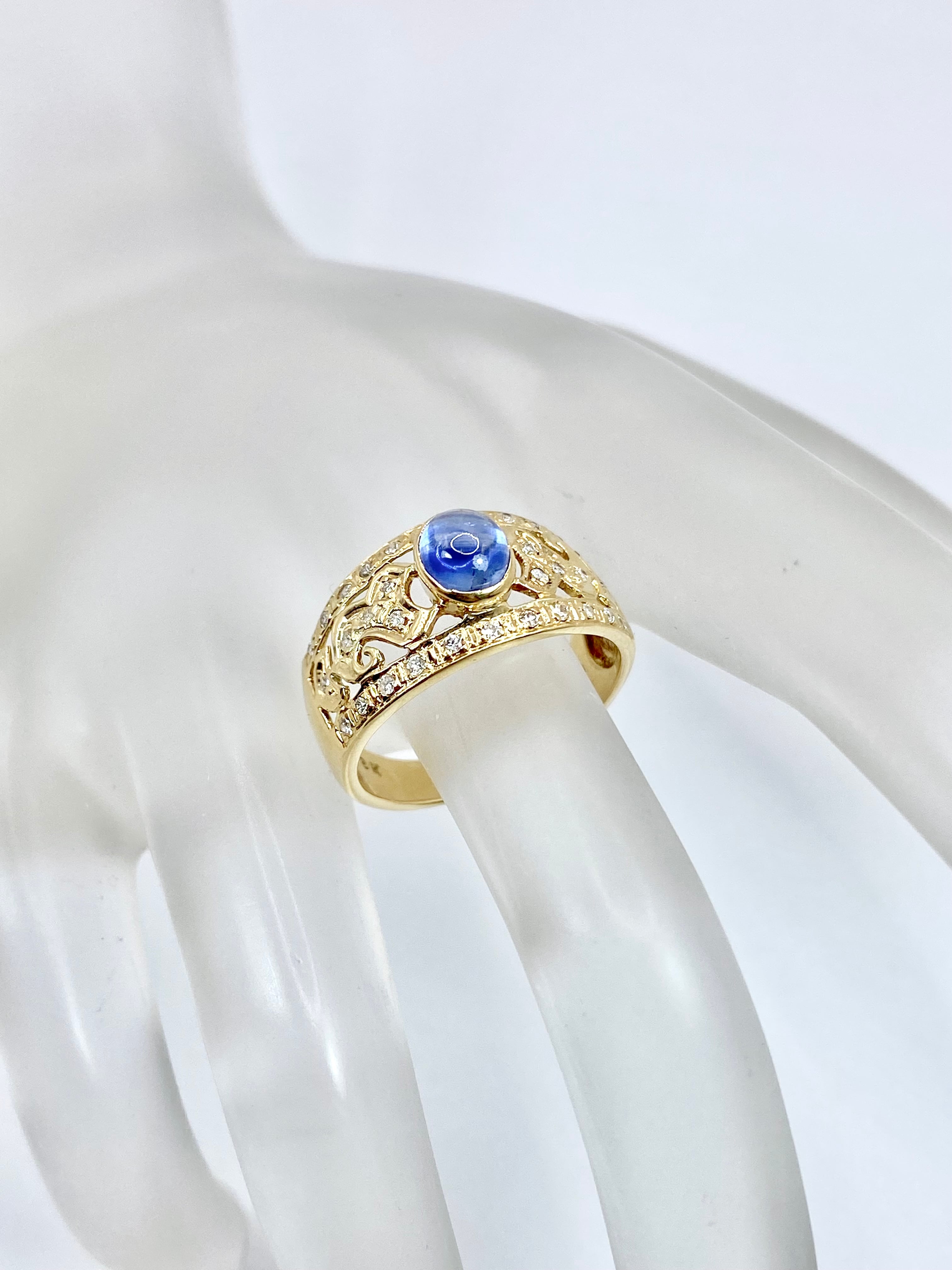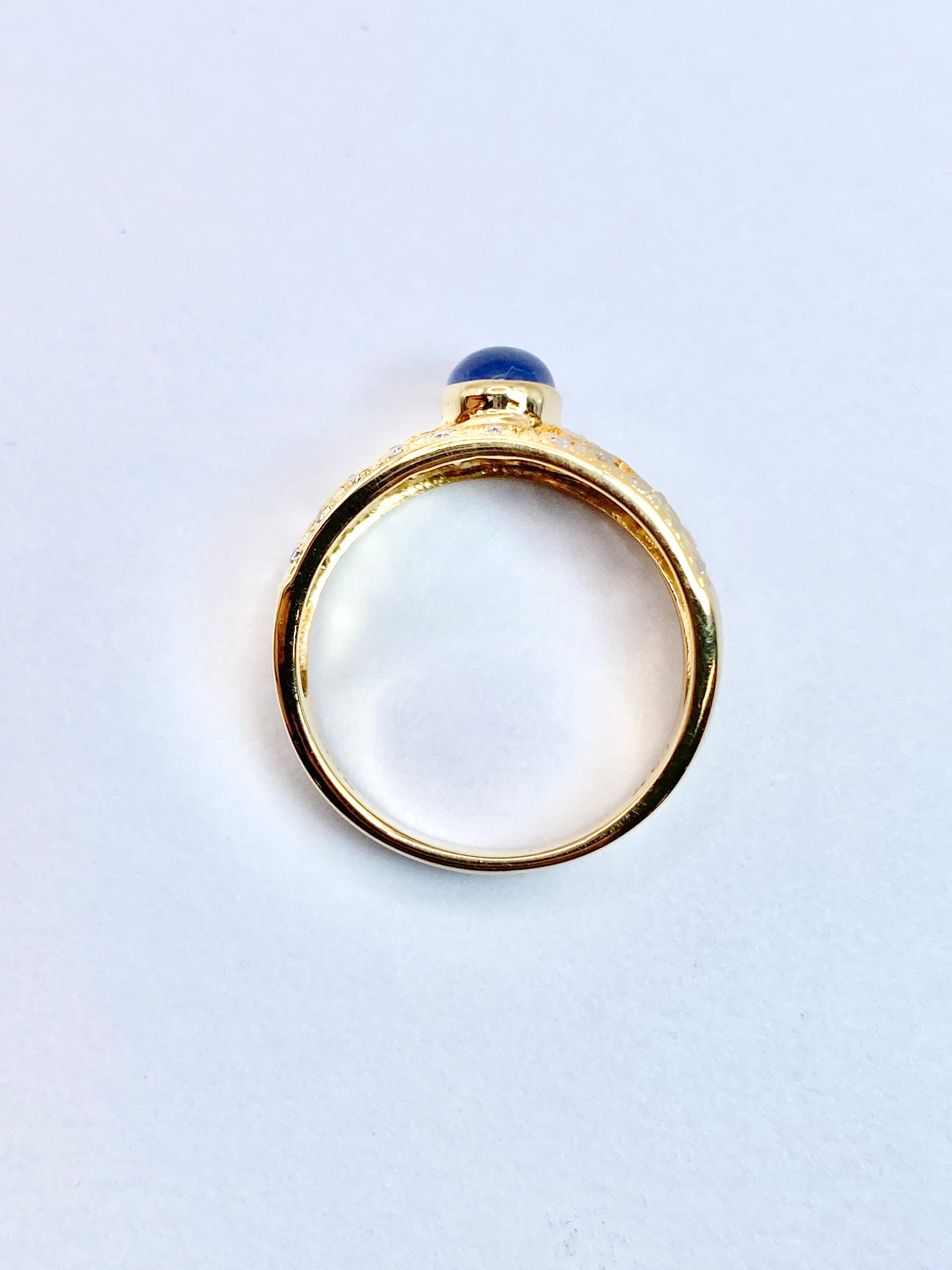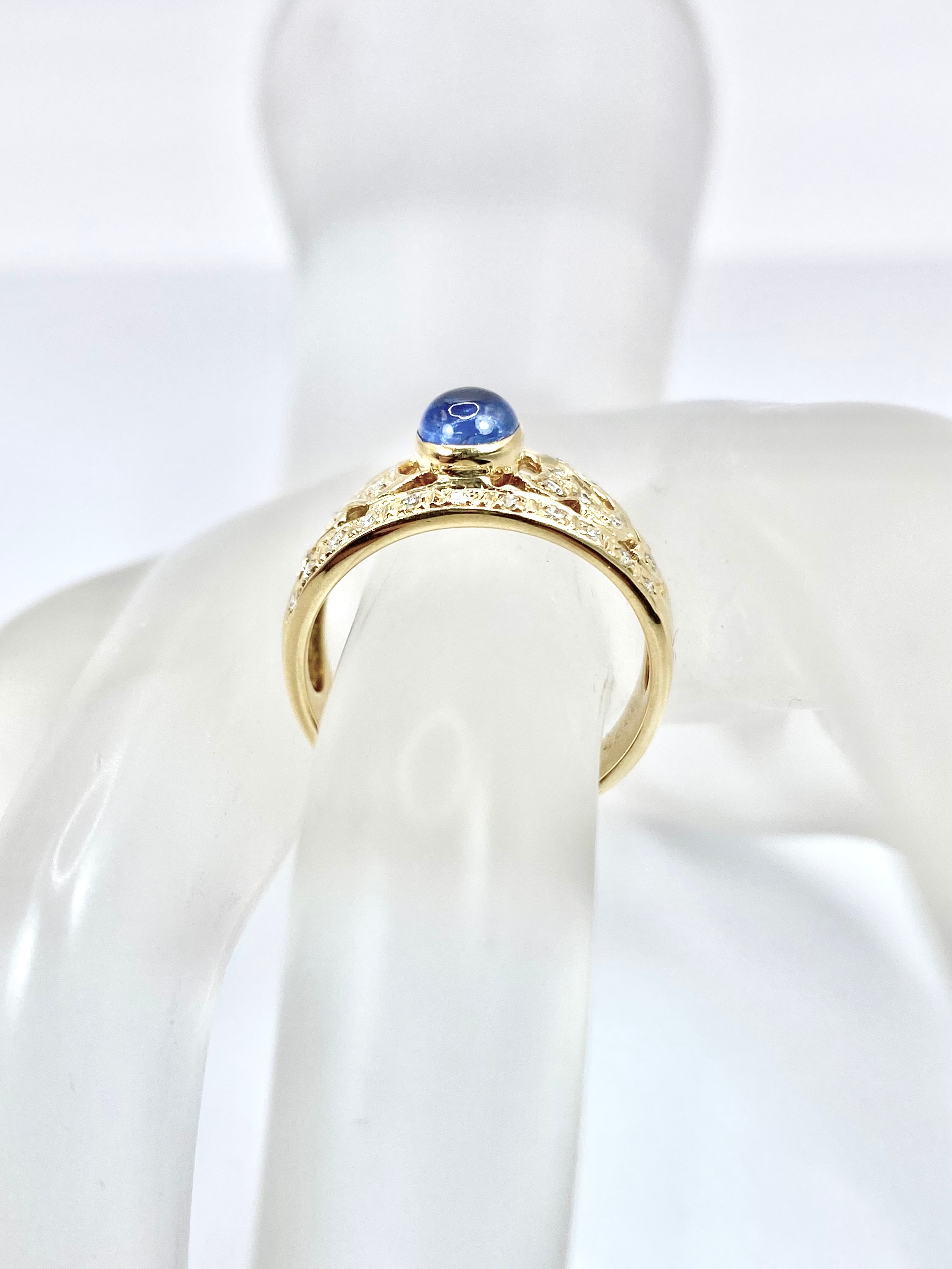 カボションのサファイアがちょこんと留められたリングですね。スターサファイアとは異なりスターは現れませんが、カボションカットのサファイアとしては黒みが感じられず、内包物も少なめ。ぱっと見でも十分な透明感があります。