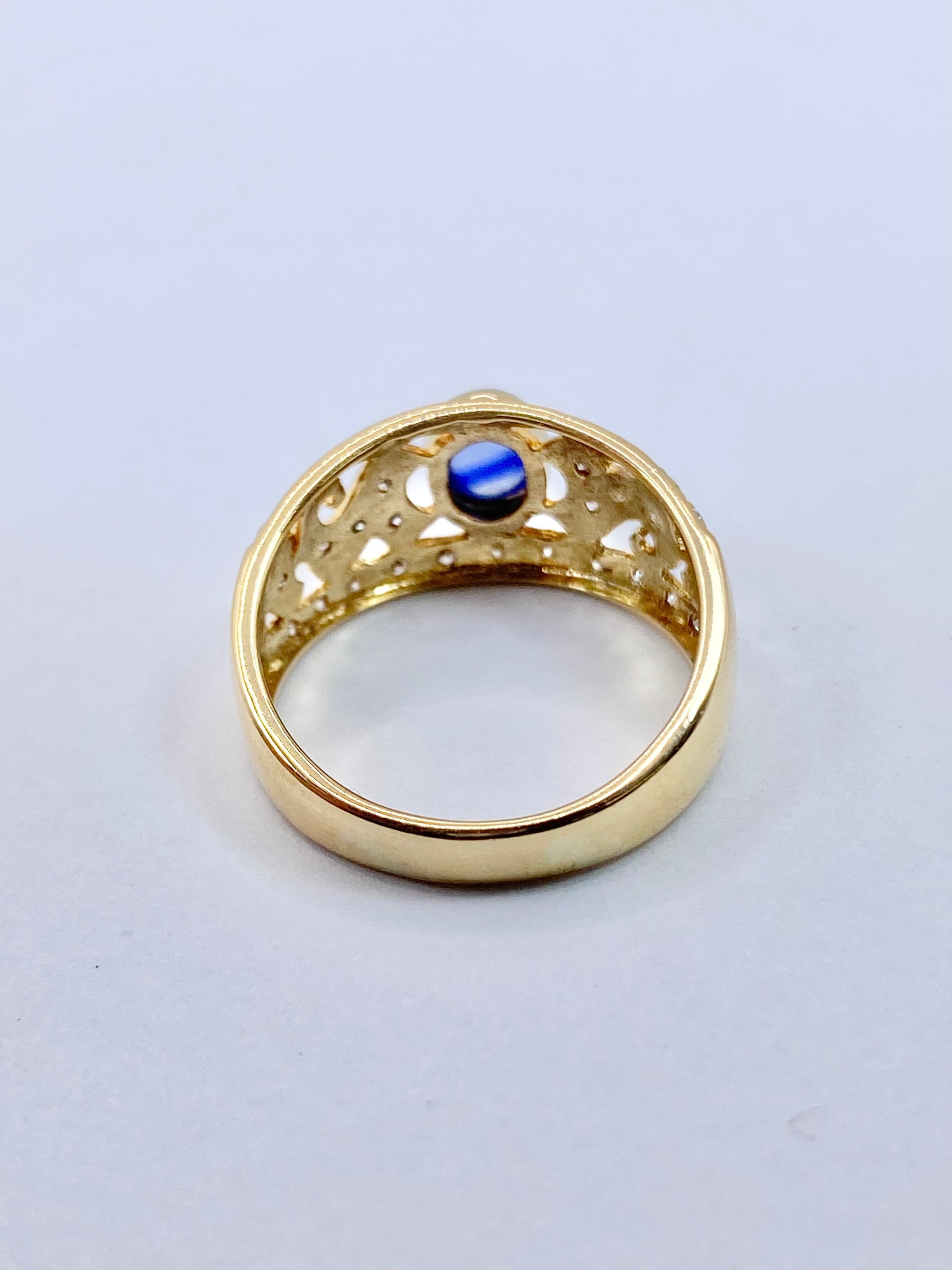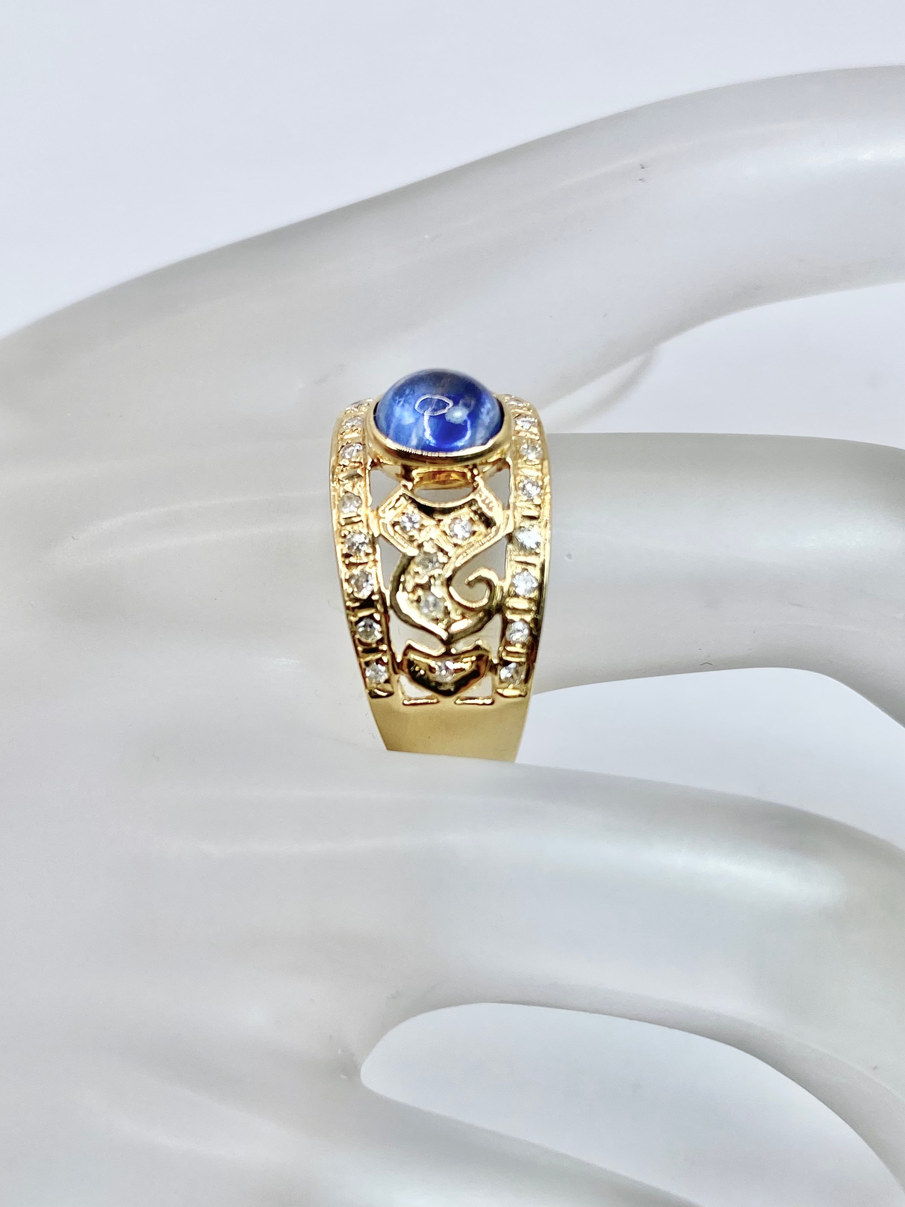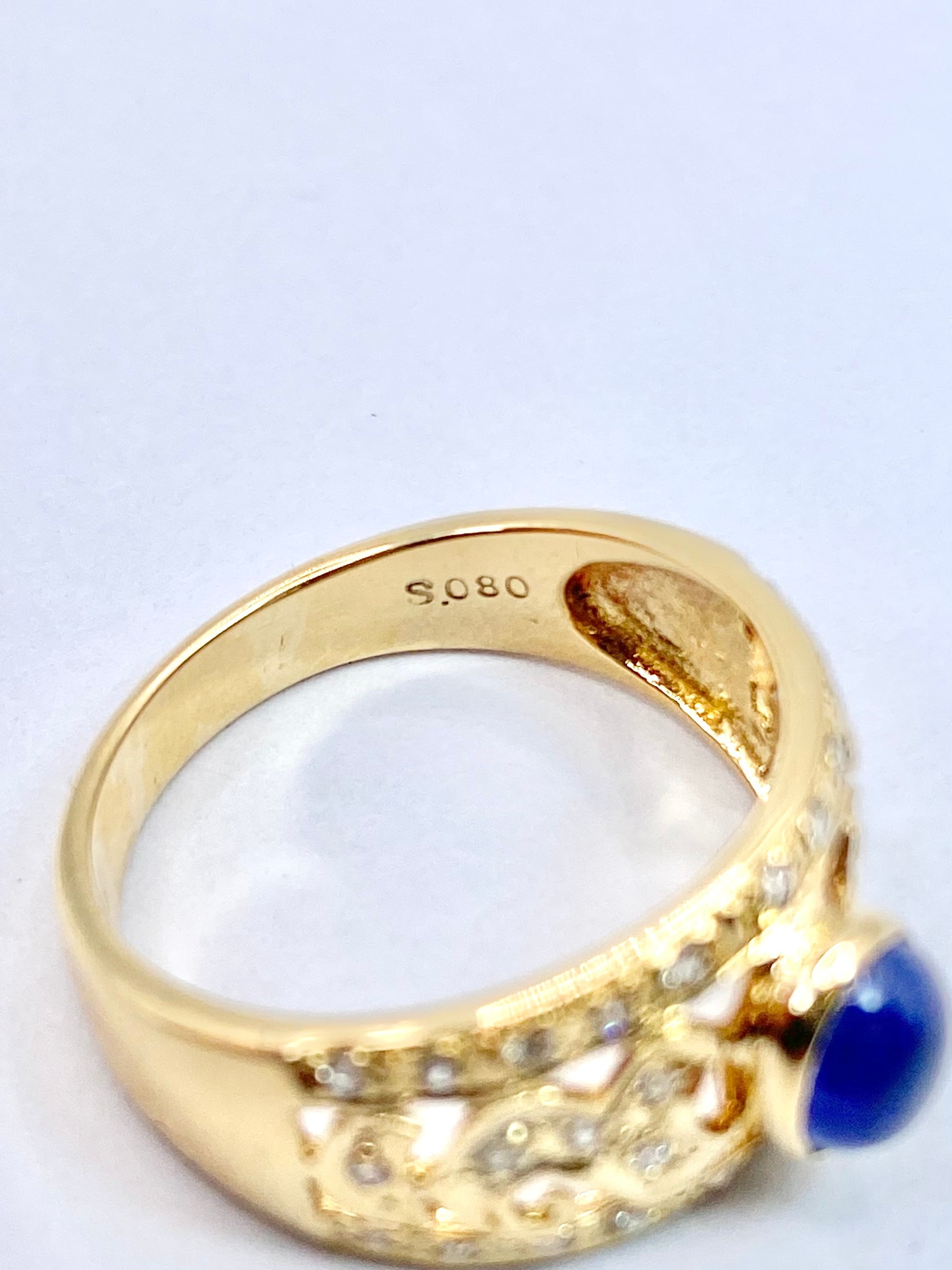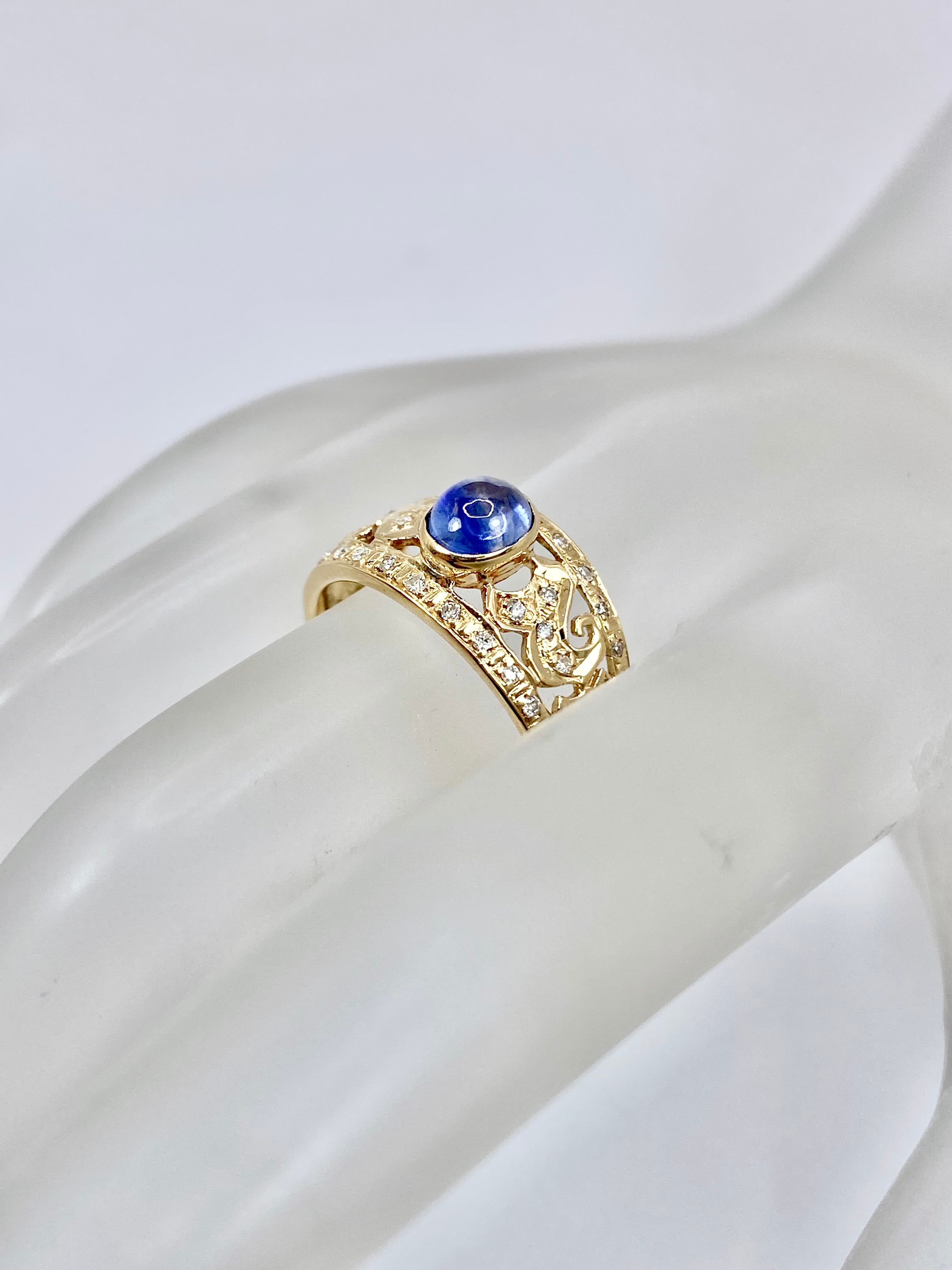 カボションのサファイアがちょこんと留められたリングですね。スターサファイアとは異なりスターは現れませんが、カボションカットのサファイアとしては黒みが感じられず、内包物も少なめ。ぱっと見でも十分な透明感があります。