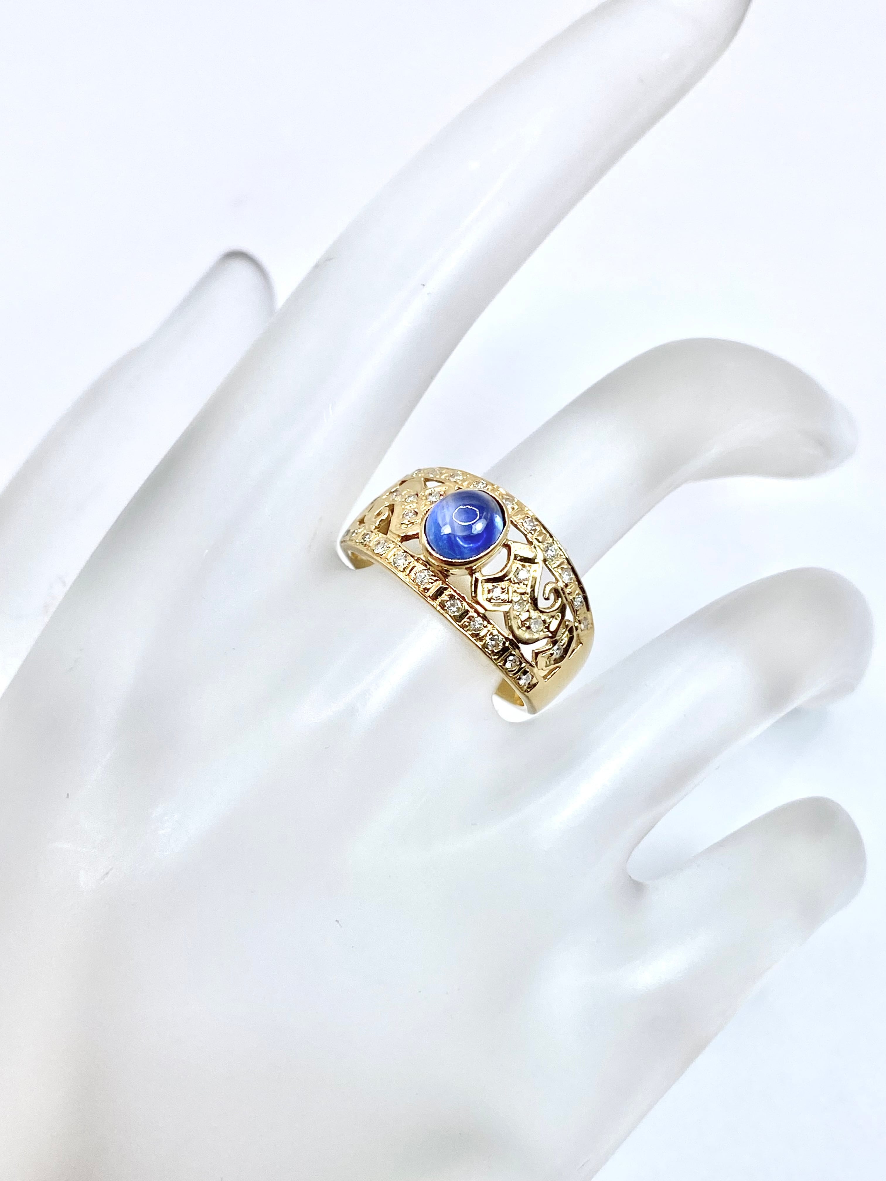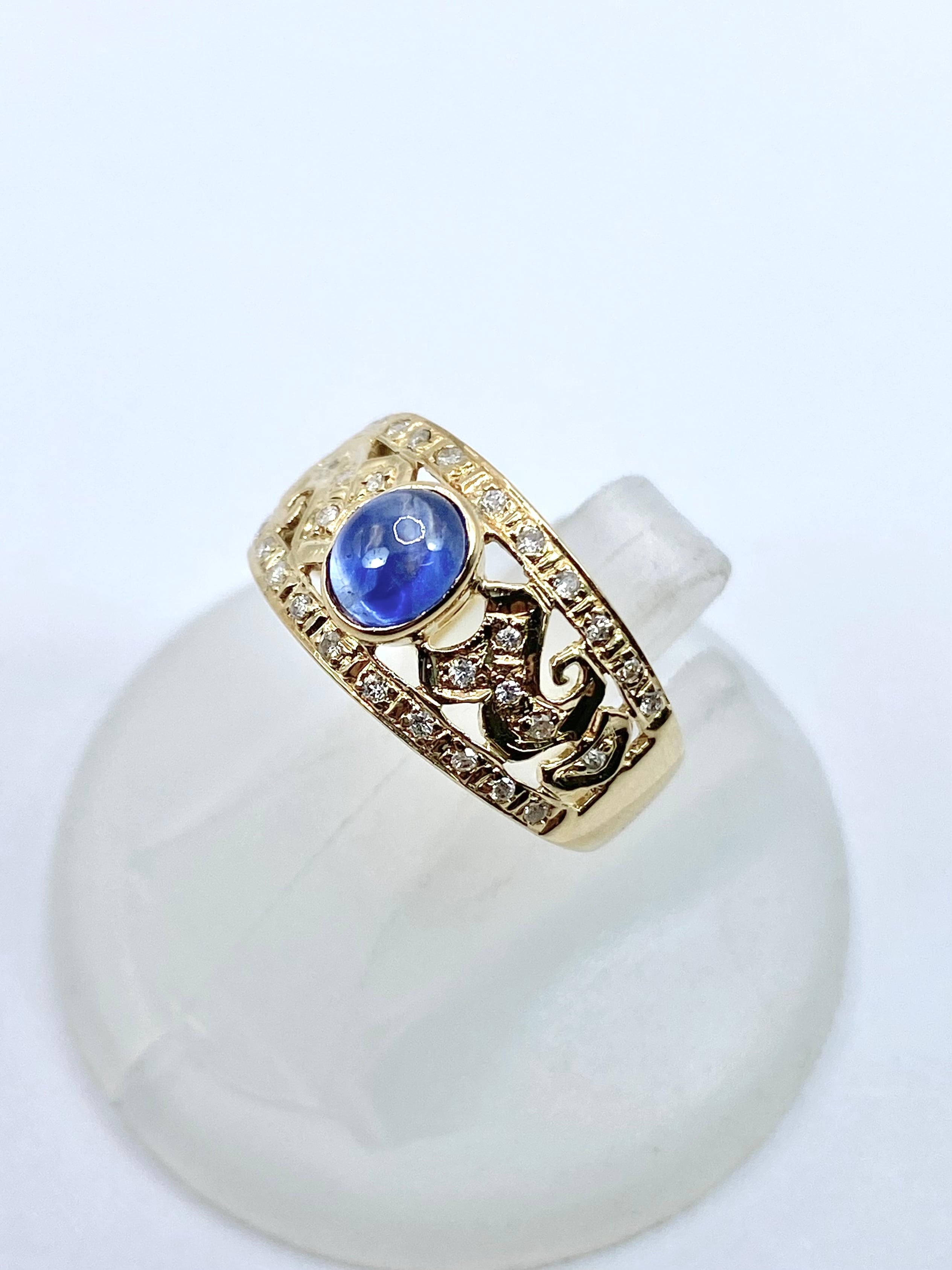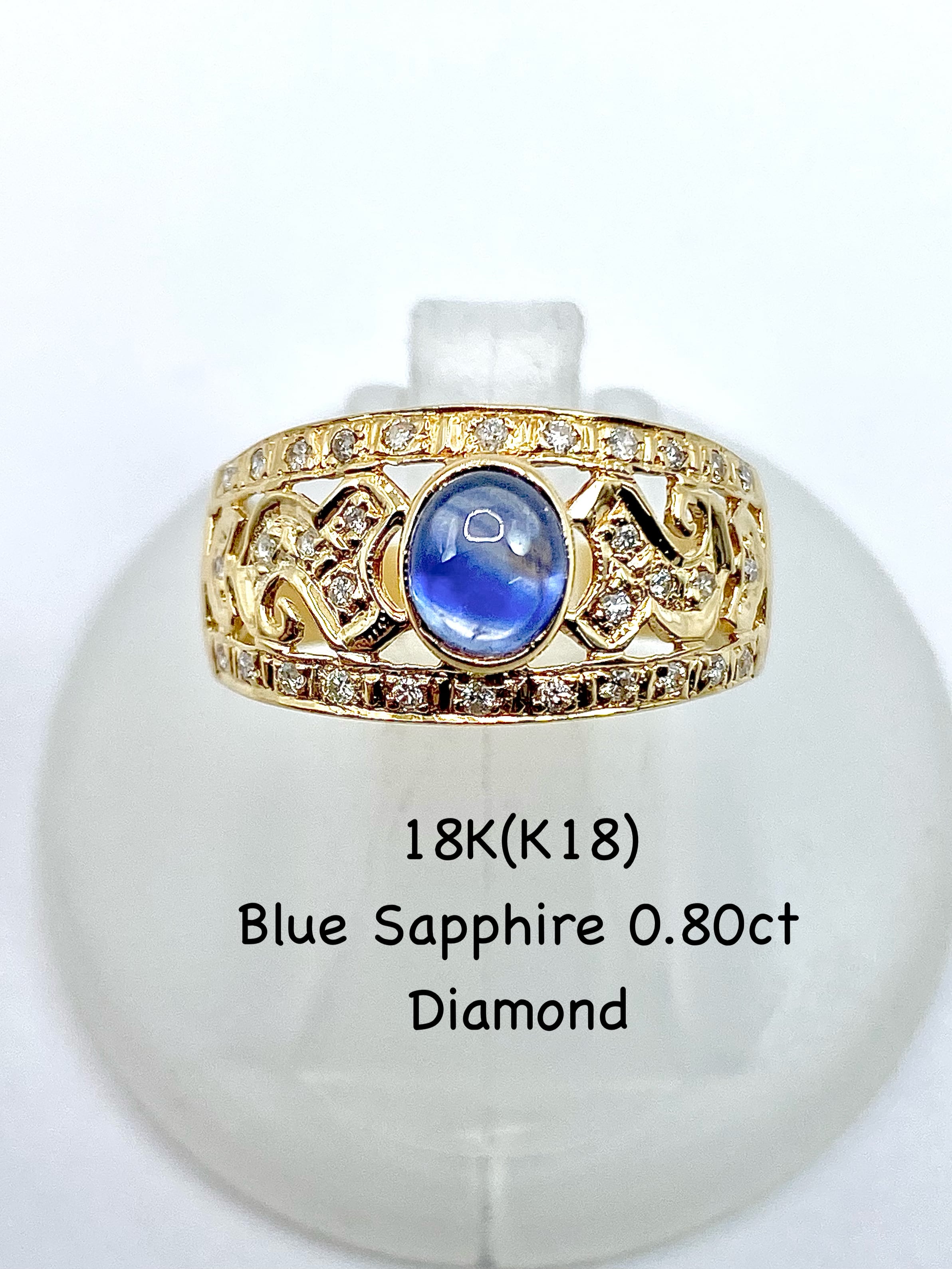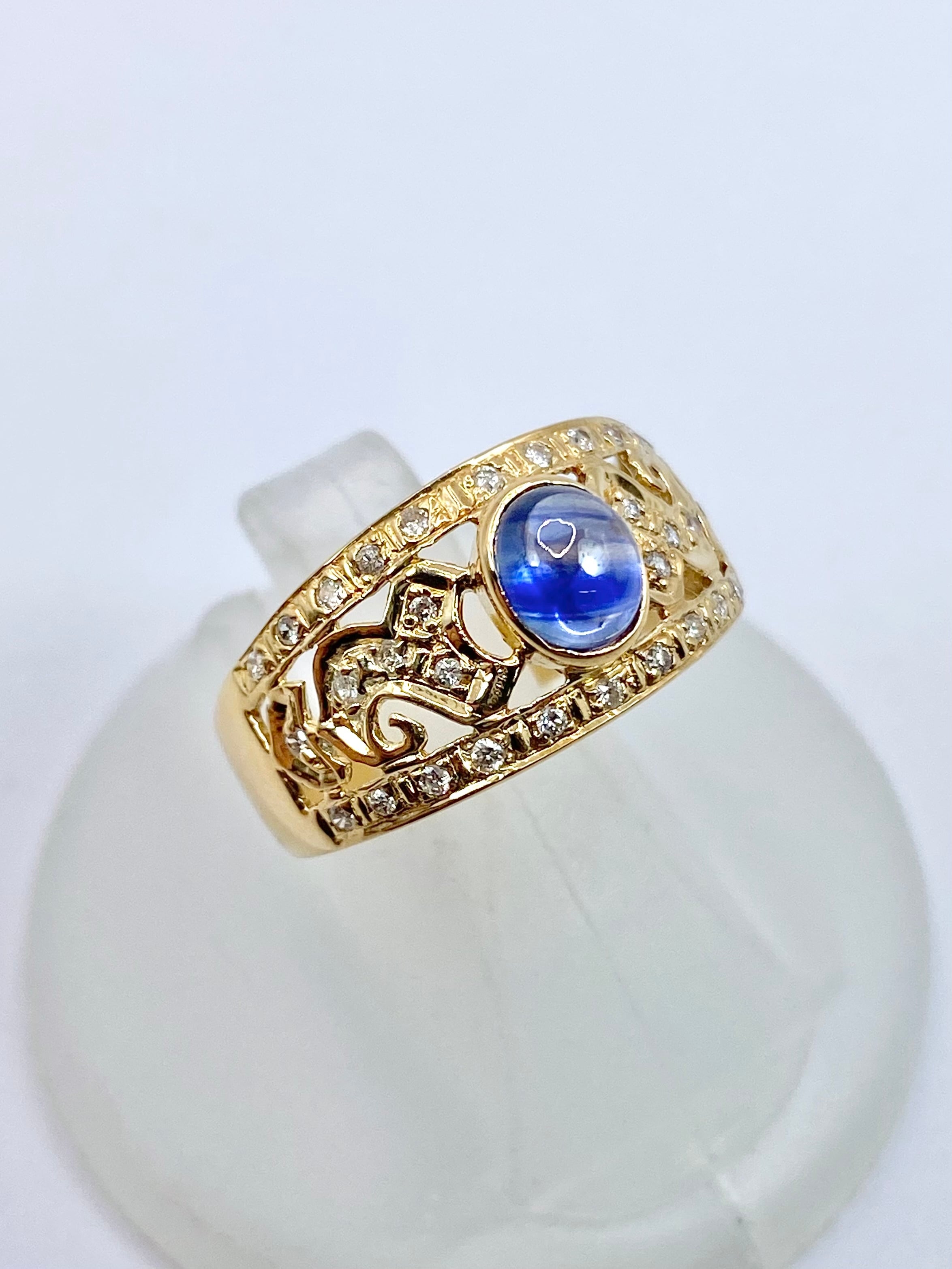 ブルーサファイアのリングというとプラチナが多めで、金枠は稀少。細身でないものとなると更に見かけないことと思います。更にサファイアがカボションカットというところも個性的ですね。少し変わった金枠のサファイアリングをお探しの方、お迎えをお待ちしております。