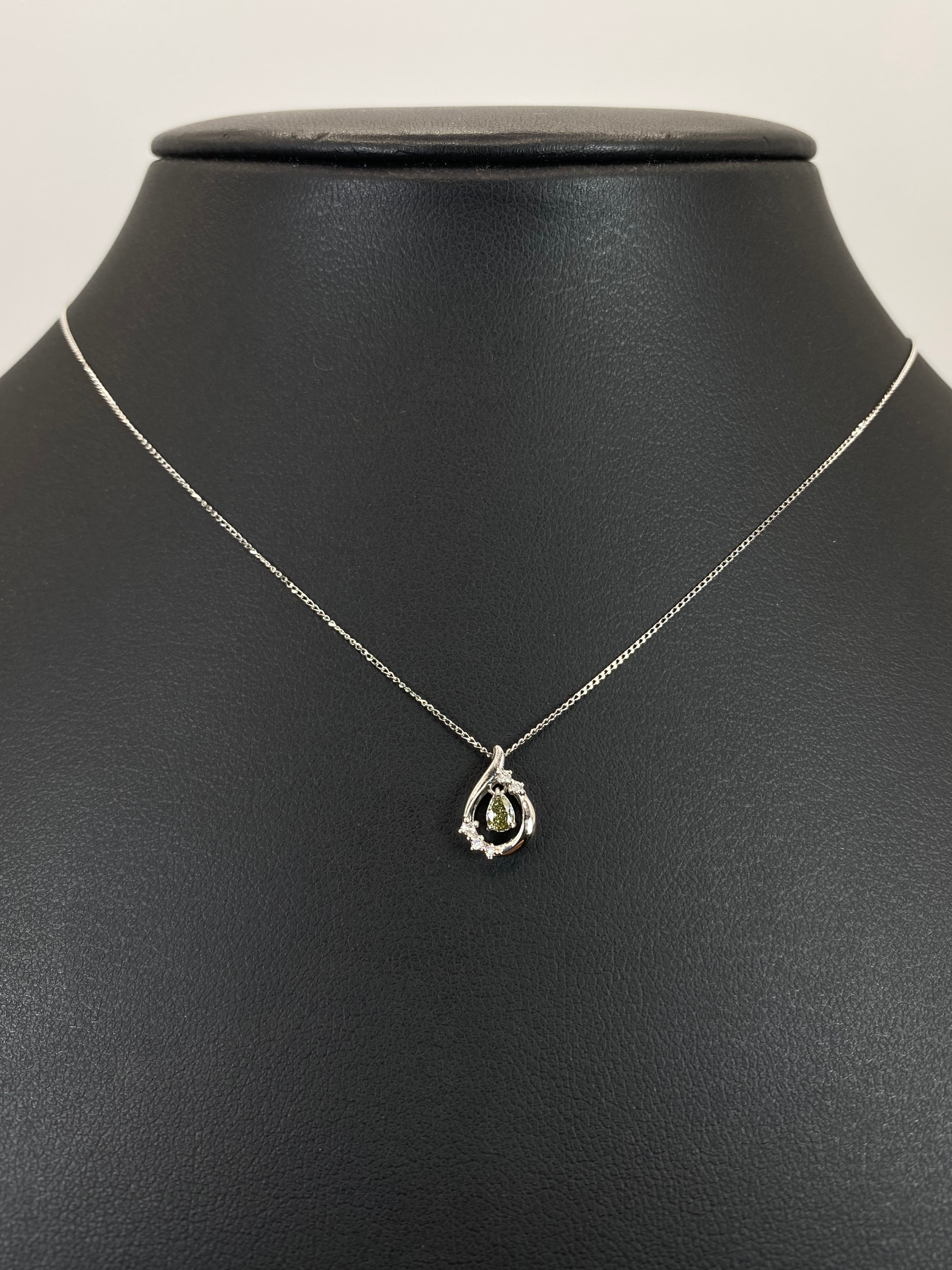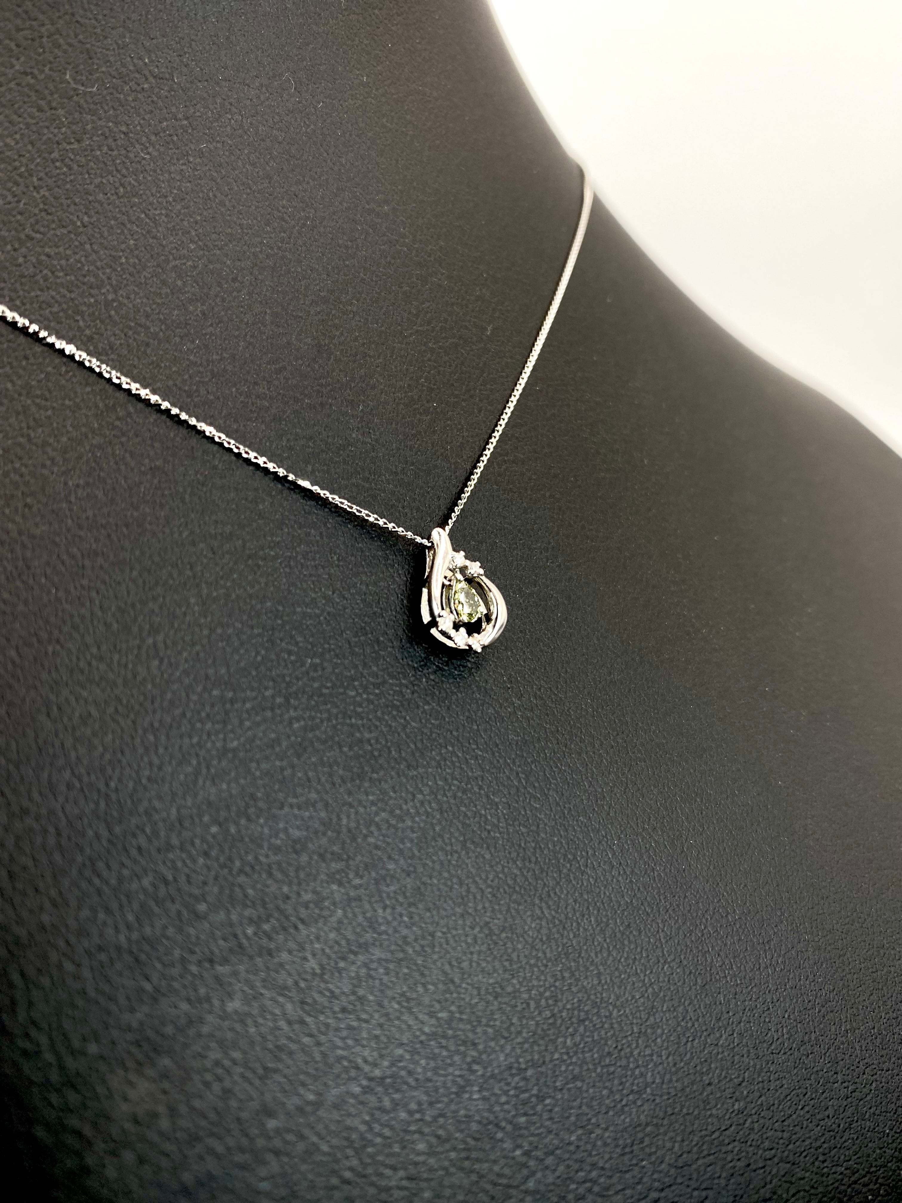 一定条件下で変彩するという、稀少かつ変わった特性を持つダイヤモンド・・・通称カメレオンダイヤモンド。こちらを中心に、周囲に5粒のダイヤモンドをあしらった雫型のシンプルなネックレスですね。