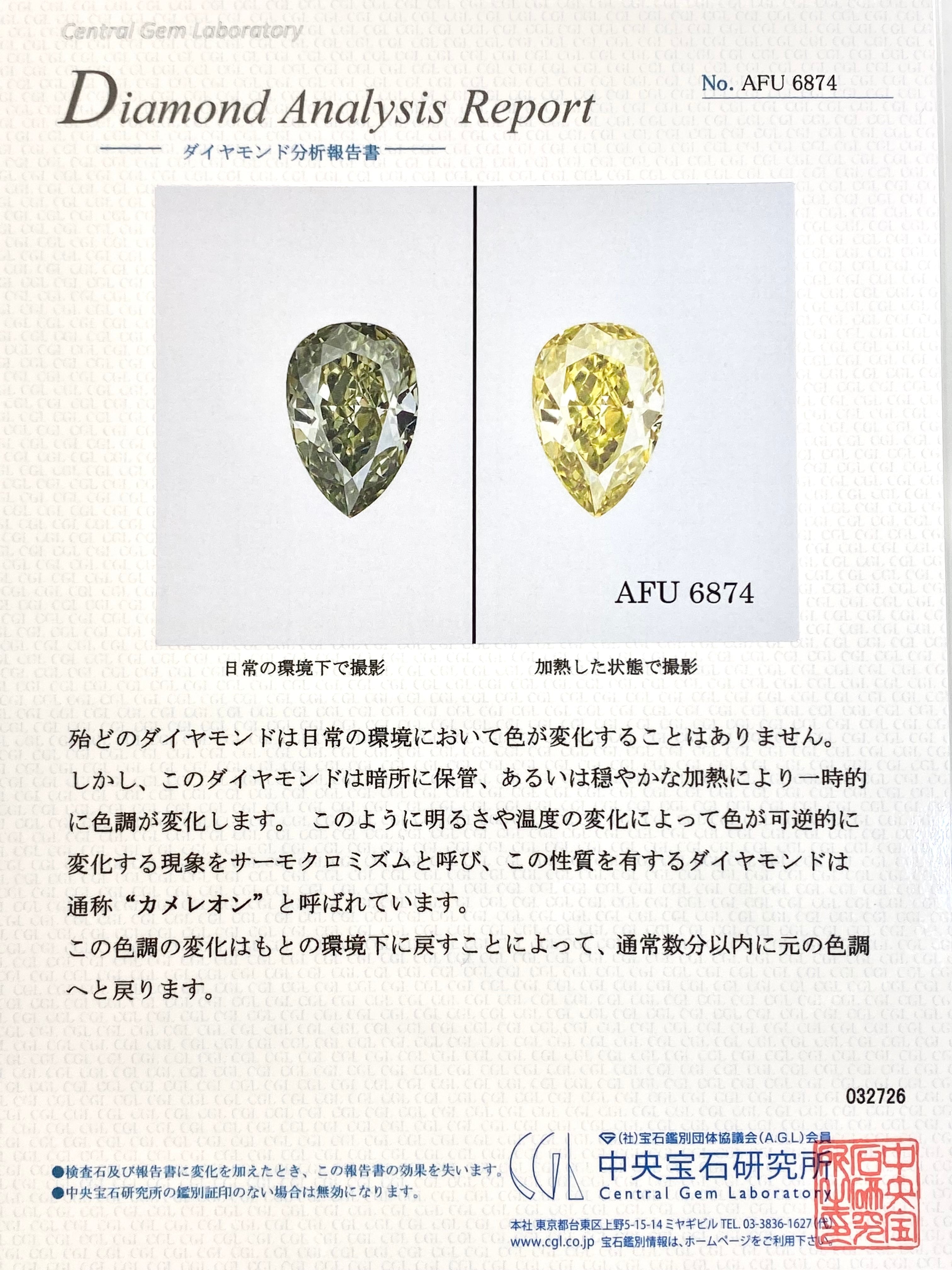 鑑別機関コメント:暗所に保管、あるいは穏やかな加熱により一時的に色調が変化することから、通称 カメレオンと呼ばれています。(詳細は色彩変化の写真付きのダイヤモンド分析報告書をご覧ください)