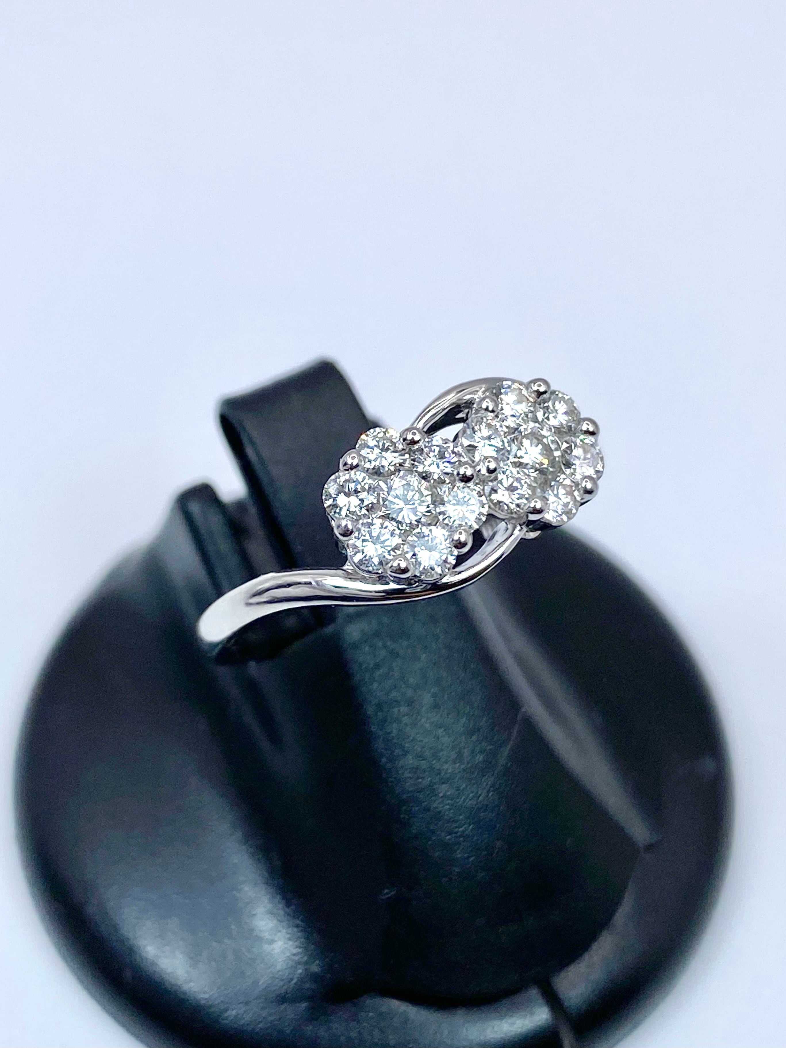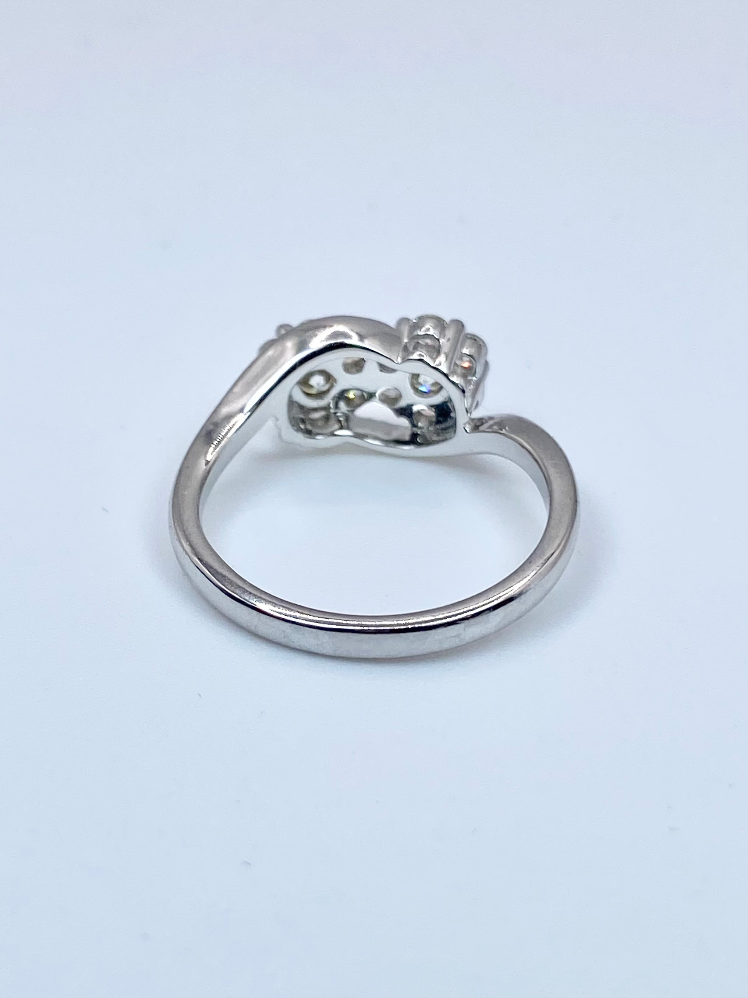 7ピースのダイヤモンドが円く留められた石座が2つ並んだリングですね。ダイヤモンドは中央の1石が少し大きく、周りの6石はその縁に重なるような形で留められています。