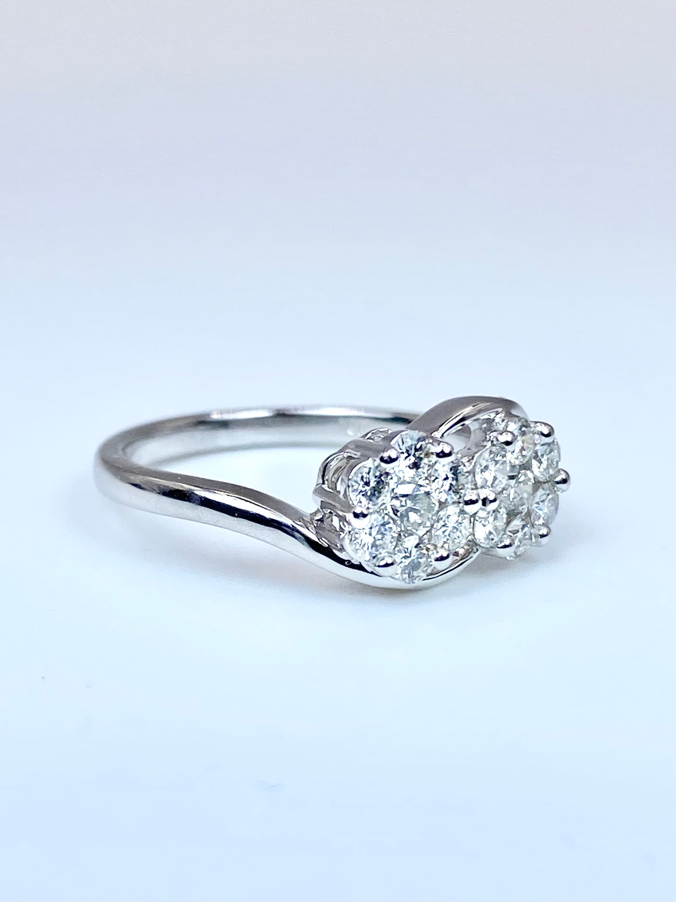 石座が横に並んでいるため上部の横幅もあり、またリングが直線的ではなく石座を抱き抱えるような形状となっているため動きのある形状でもあります。メレダイヤモンドのみの構成でありながらも、一見したボリューム、主張の強さはいかにもジュエリーといった押し出し感のある一品です。