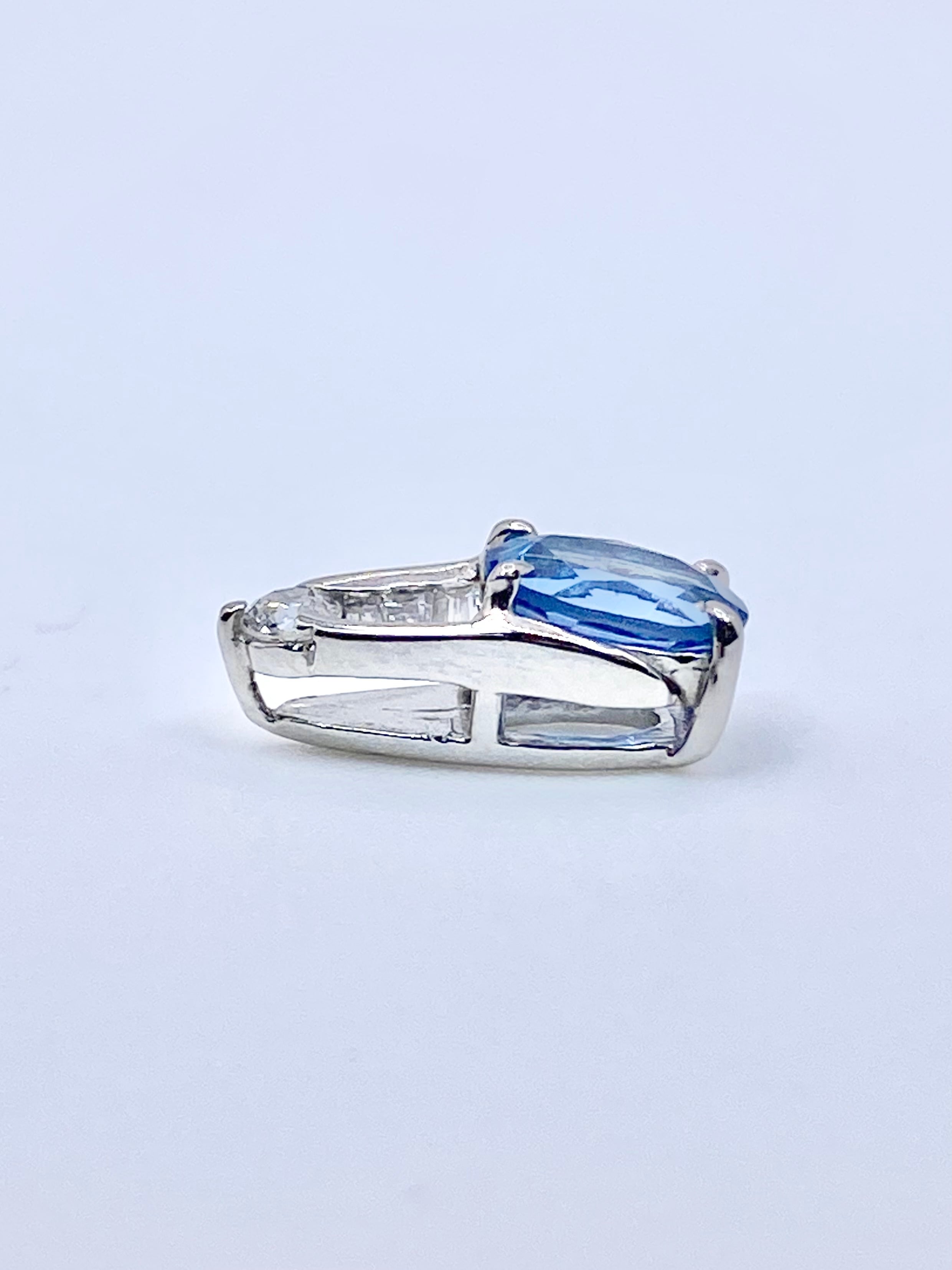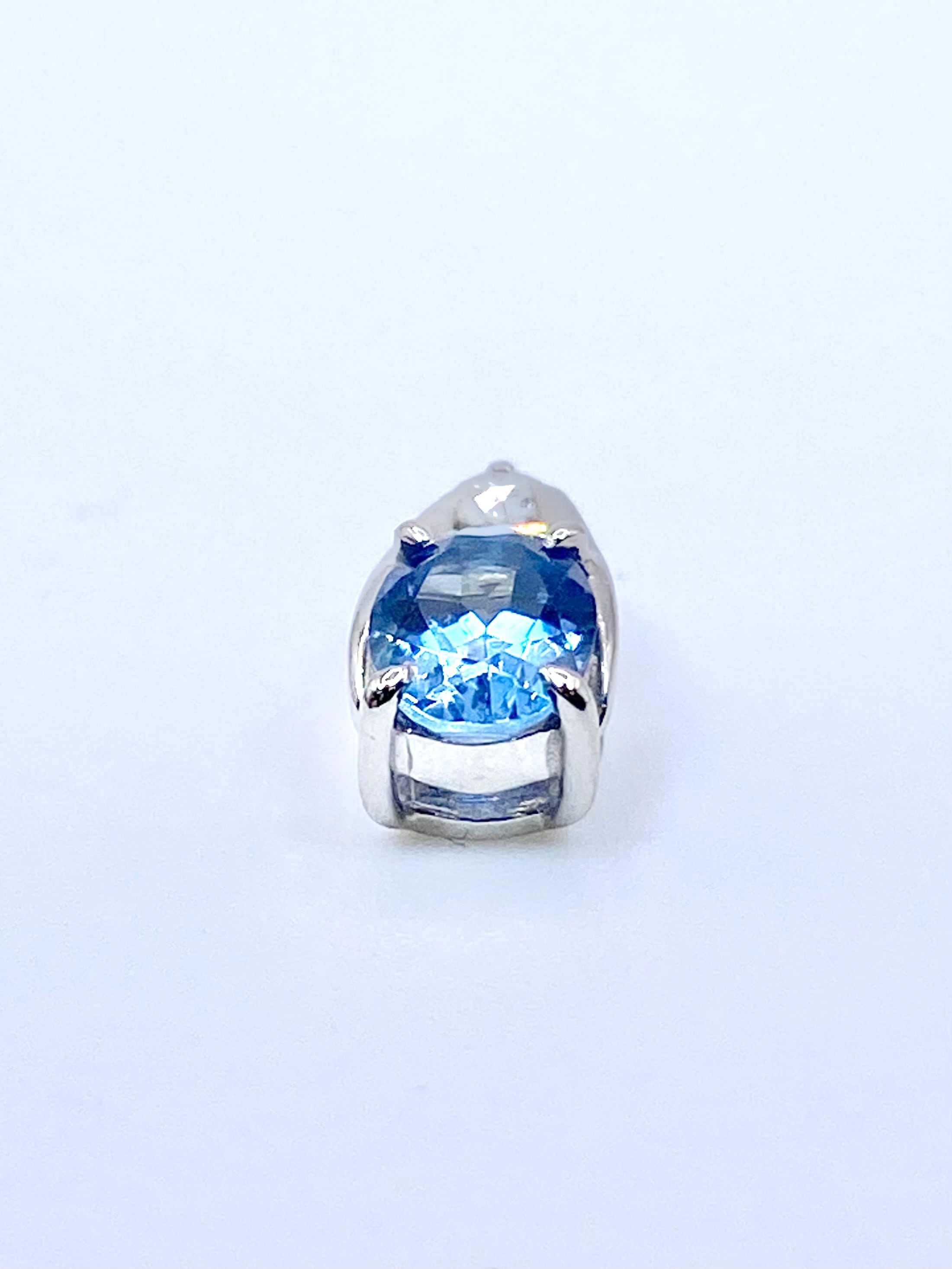 トップとしては、形状はアルファベットの「A」のようなシンプルな形のものです。下部にアクアマリン、そして上部にはテーパーカットのダイヤが組み合わせられており、その上にラウンドのダイヤが1石留められています。