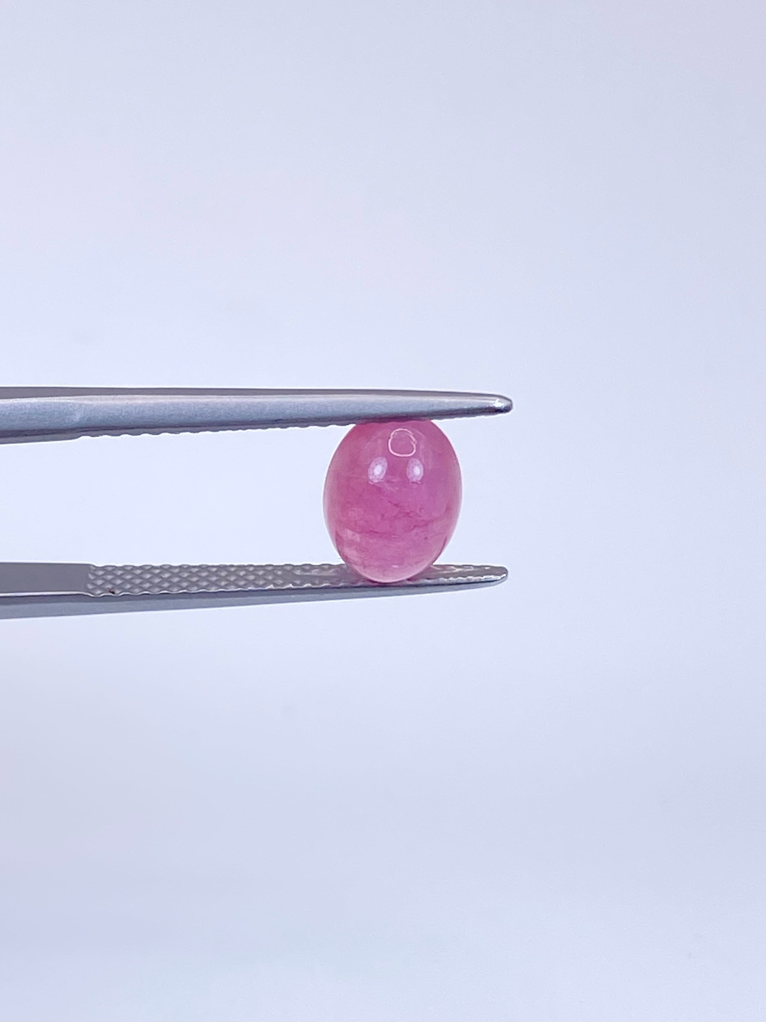 色・輝き:ピンクとパープルの中間のような蠱惑的な色合いで、側面から見るとかすかにオレンジも感じます。カボションならではの表面の艶感があると共に全体的にややミルキーで、どことなく果実のような雰囲気がある外観です。