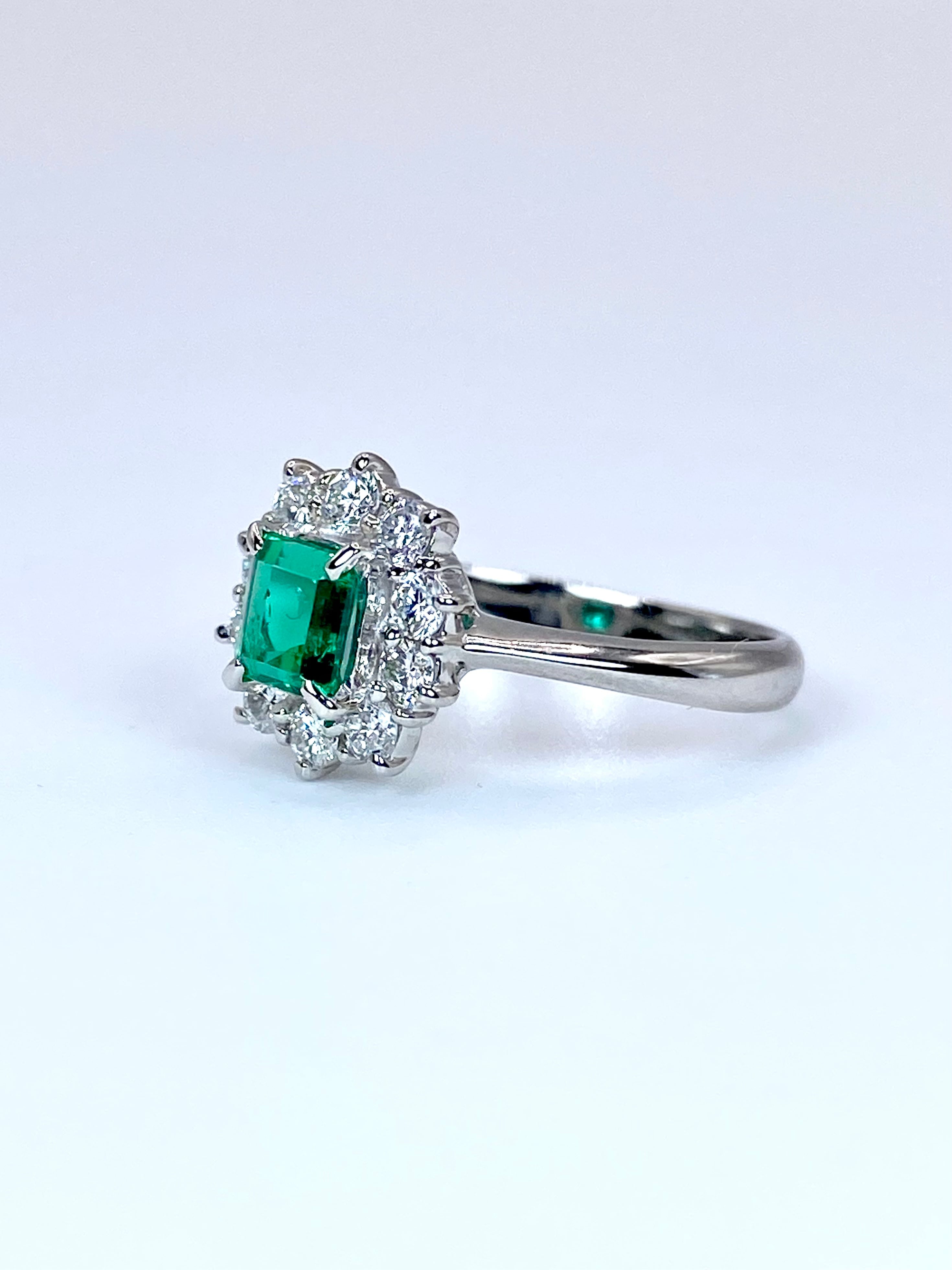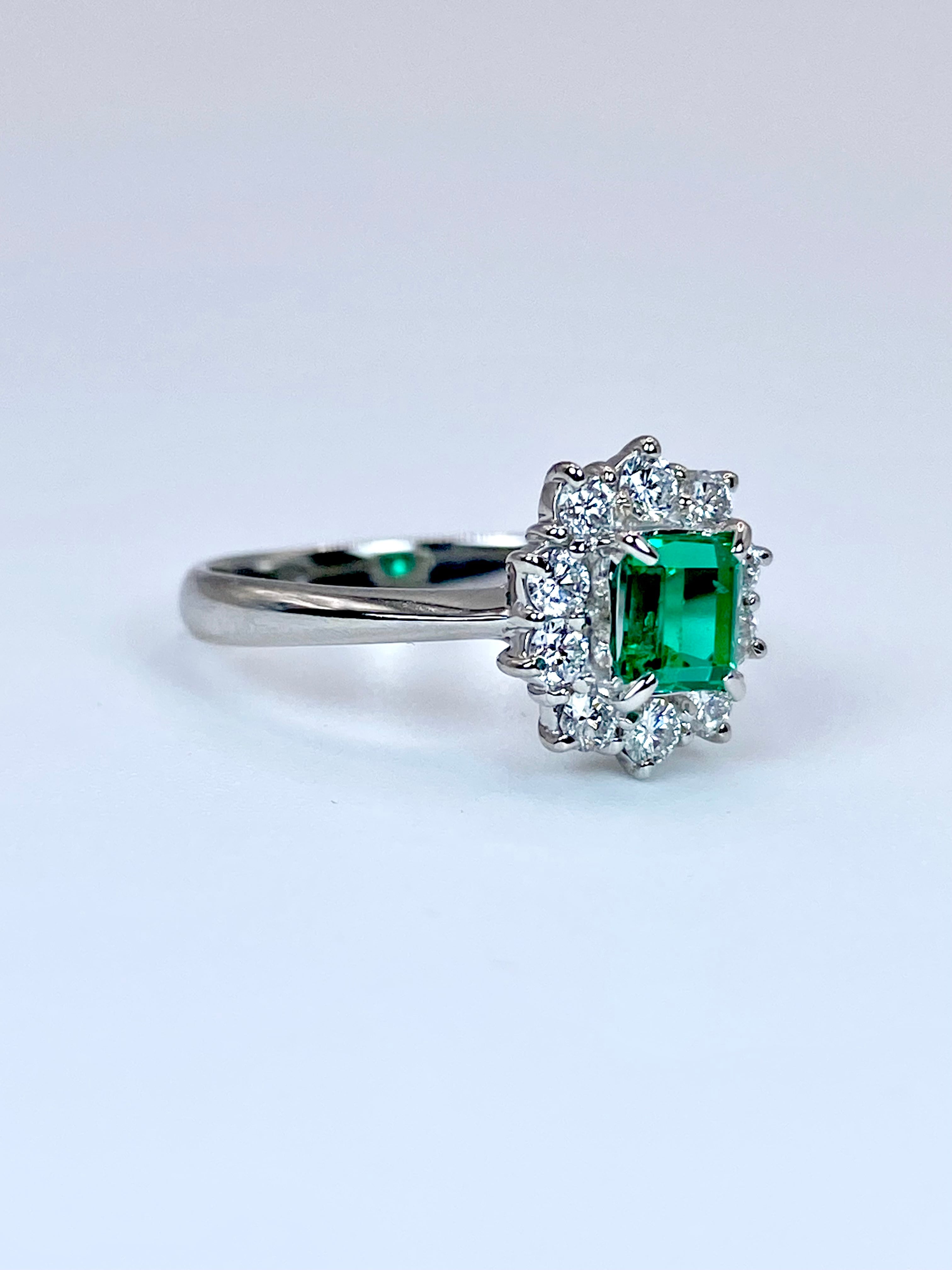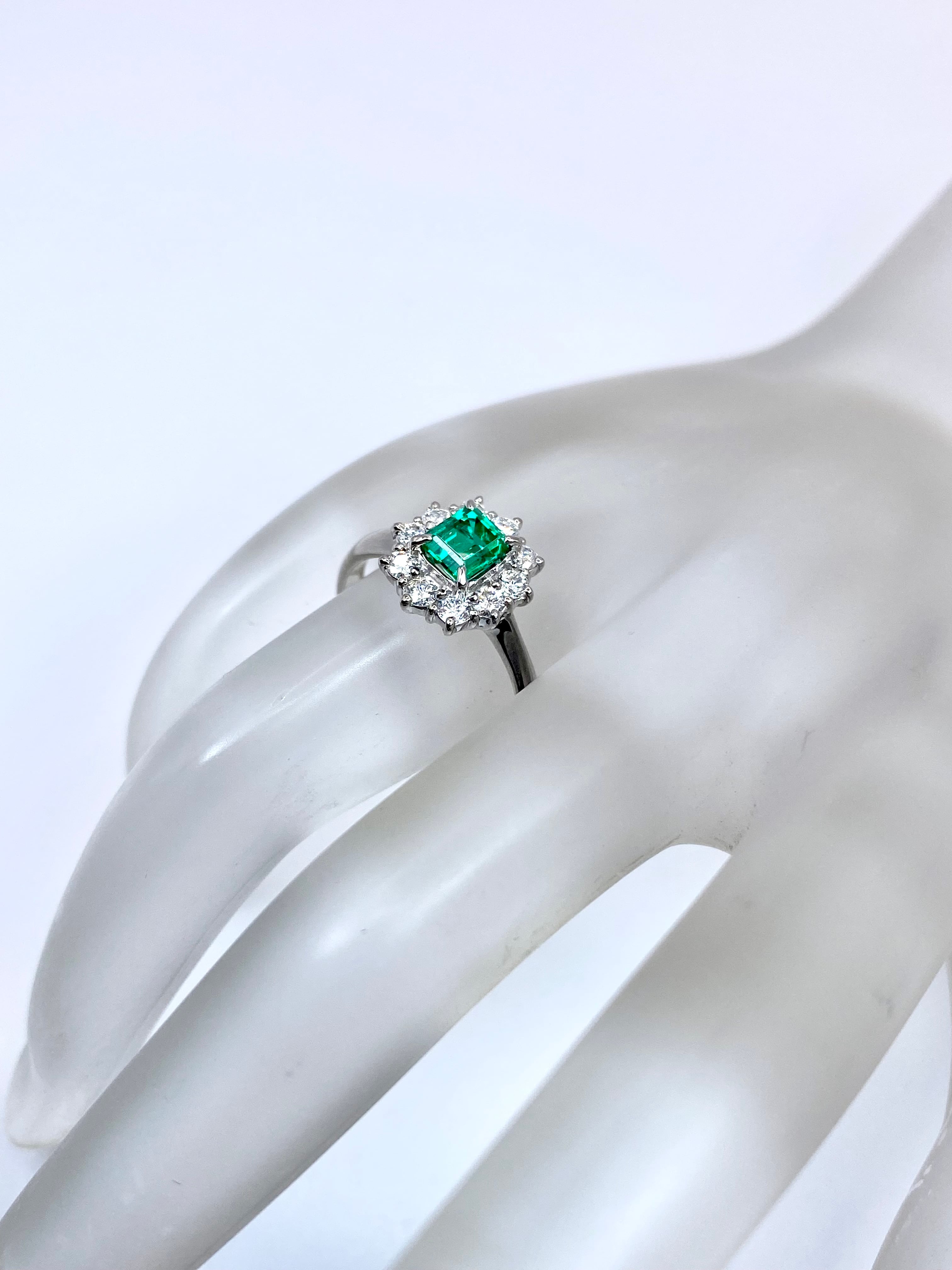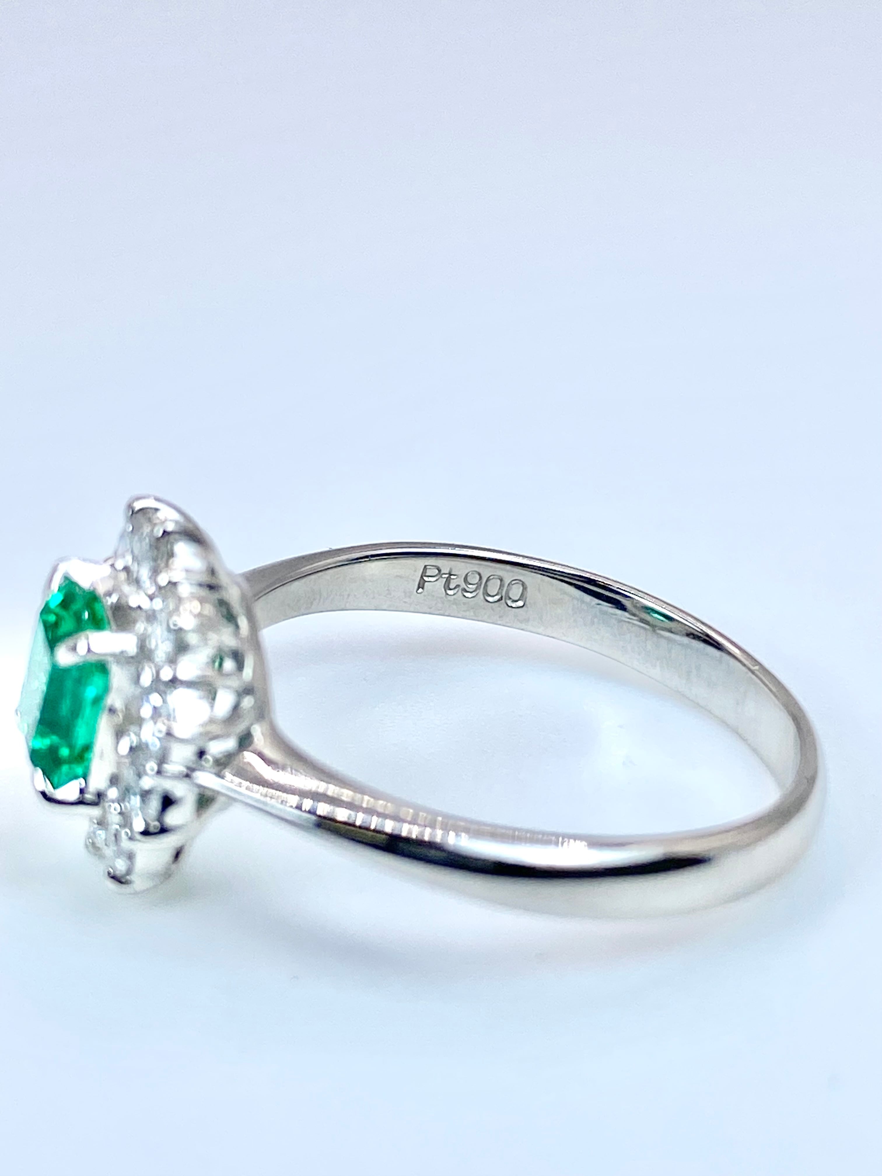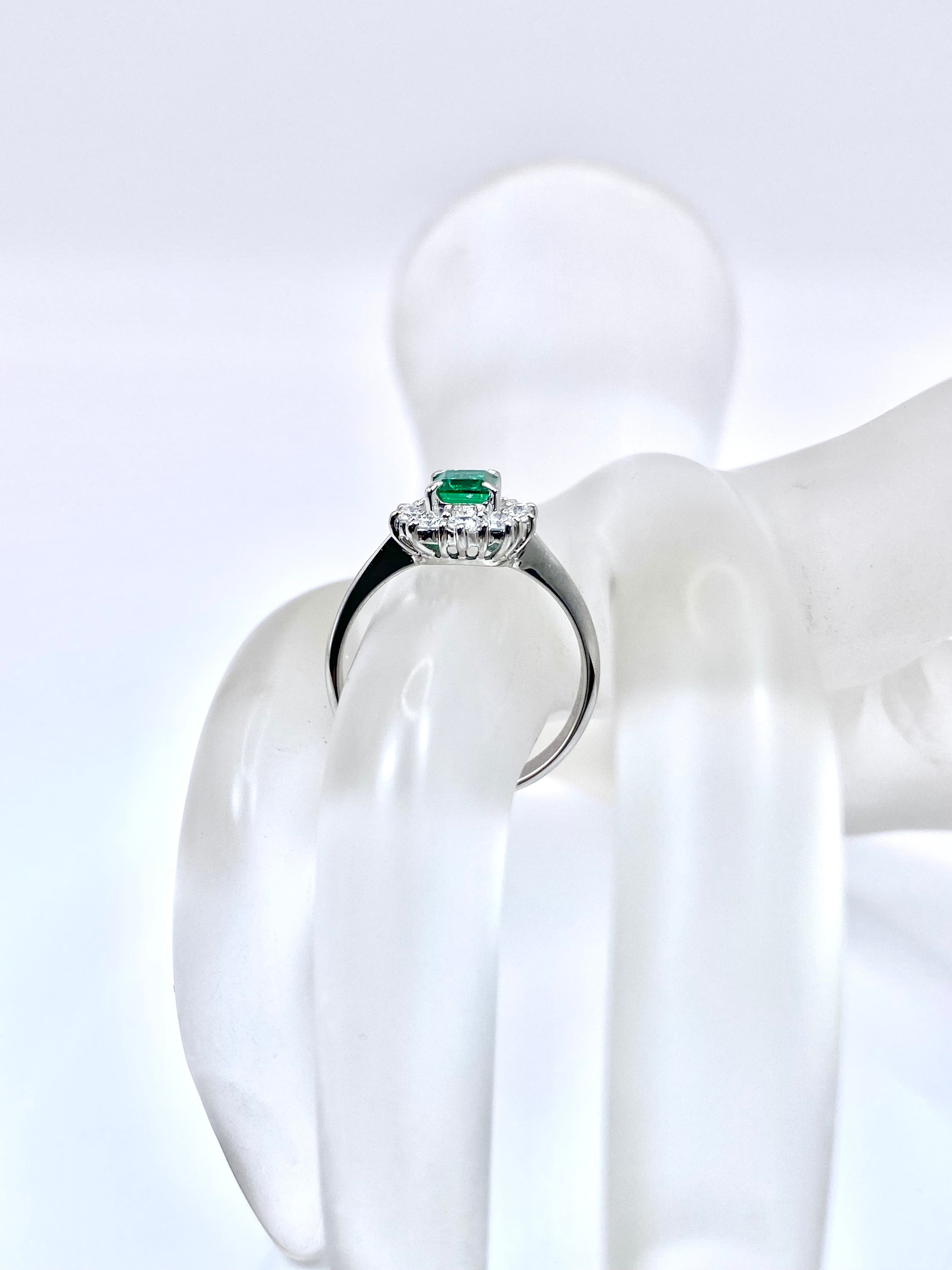 深く澄んだ、少し青味を含む緑の発色と、静かな透明感を併せ持つエメラルドを主役に、10石のダイヤモンドを取り巻いたプラチナ900リングのご紹介です。