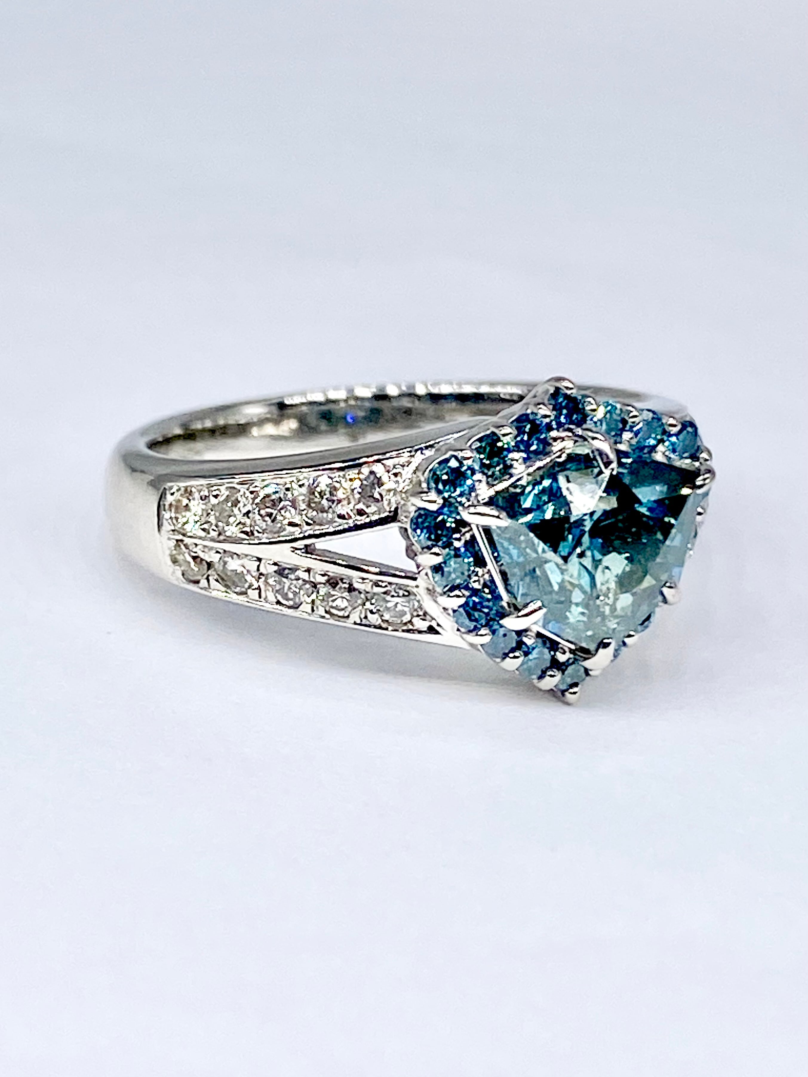 中央のダイヤモンドは、1.7ctアップとなかなかの重さ。色は純粋なブルーではなく、グリーンが混ざったグリーンブルー。更に盾を思わせるような鋭角の形状も相まって、怜悧な容貌を持つ一石です。