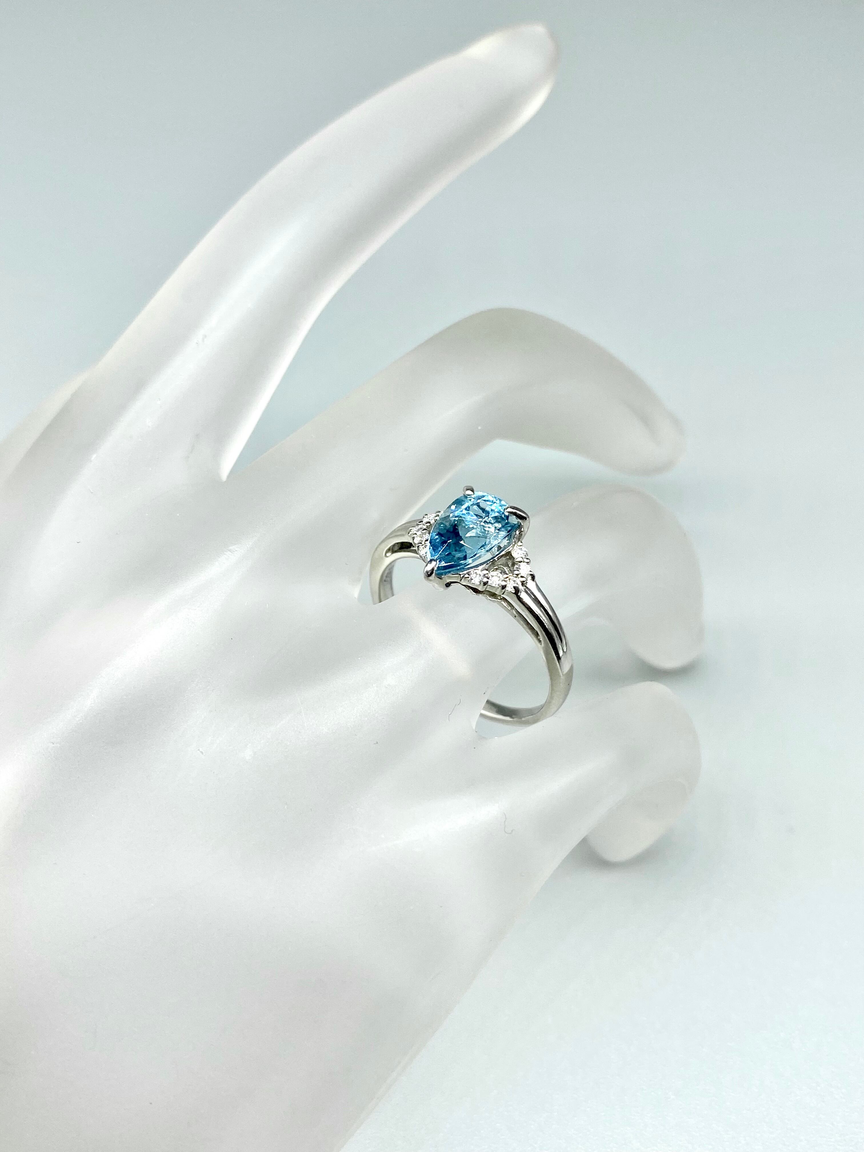 こちらのアクアマリンは、ペアシェイプの両端が濃く、中央部がやや淡いという濃淡のある色が特徴的。特に先端部は鮮やかなブルーで、リングを先端側の側面から見ると、石全体が柔らかなブルーに染まって見えます。