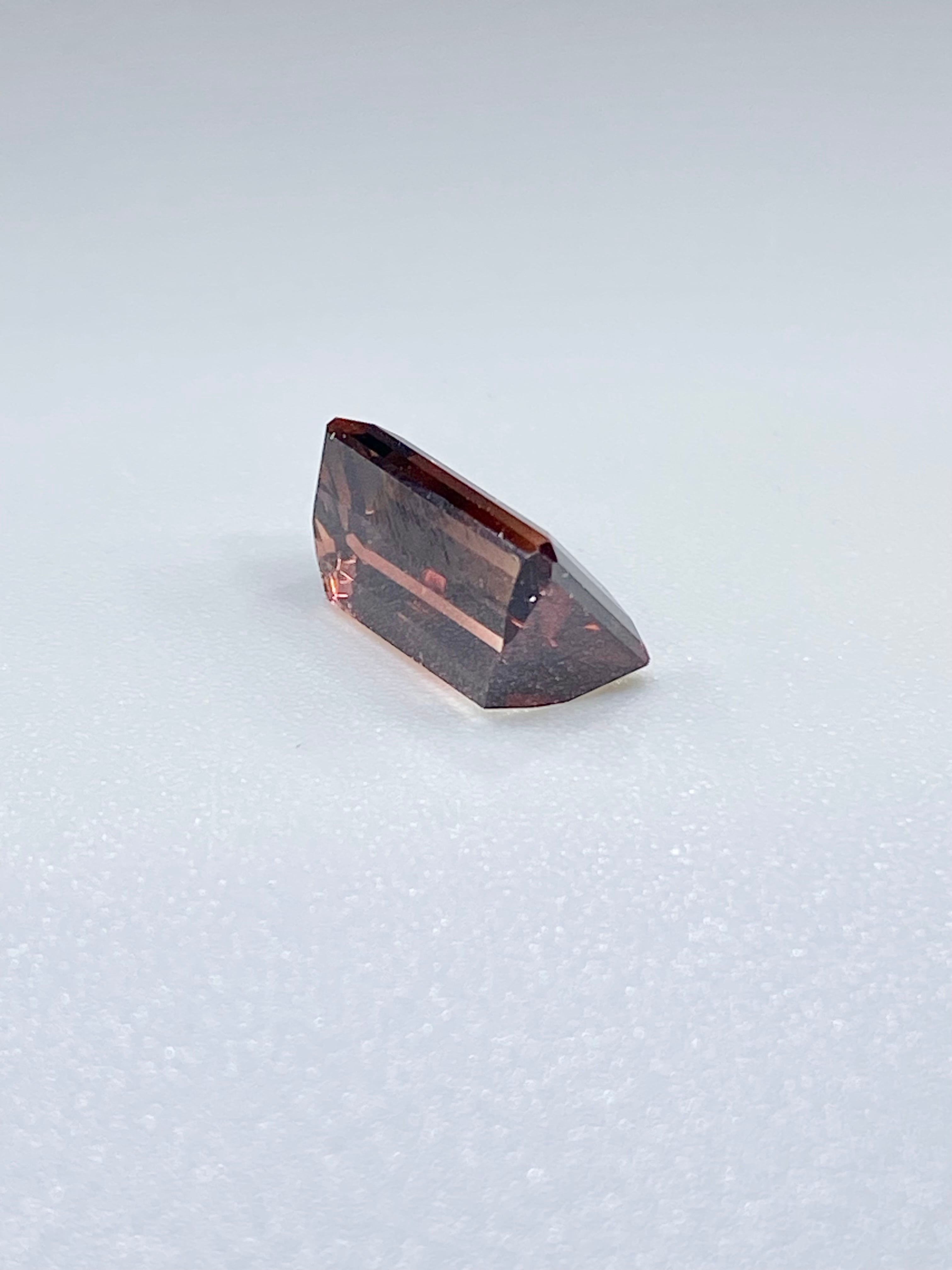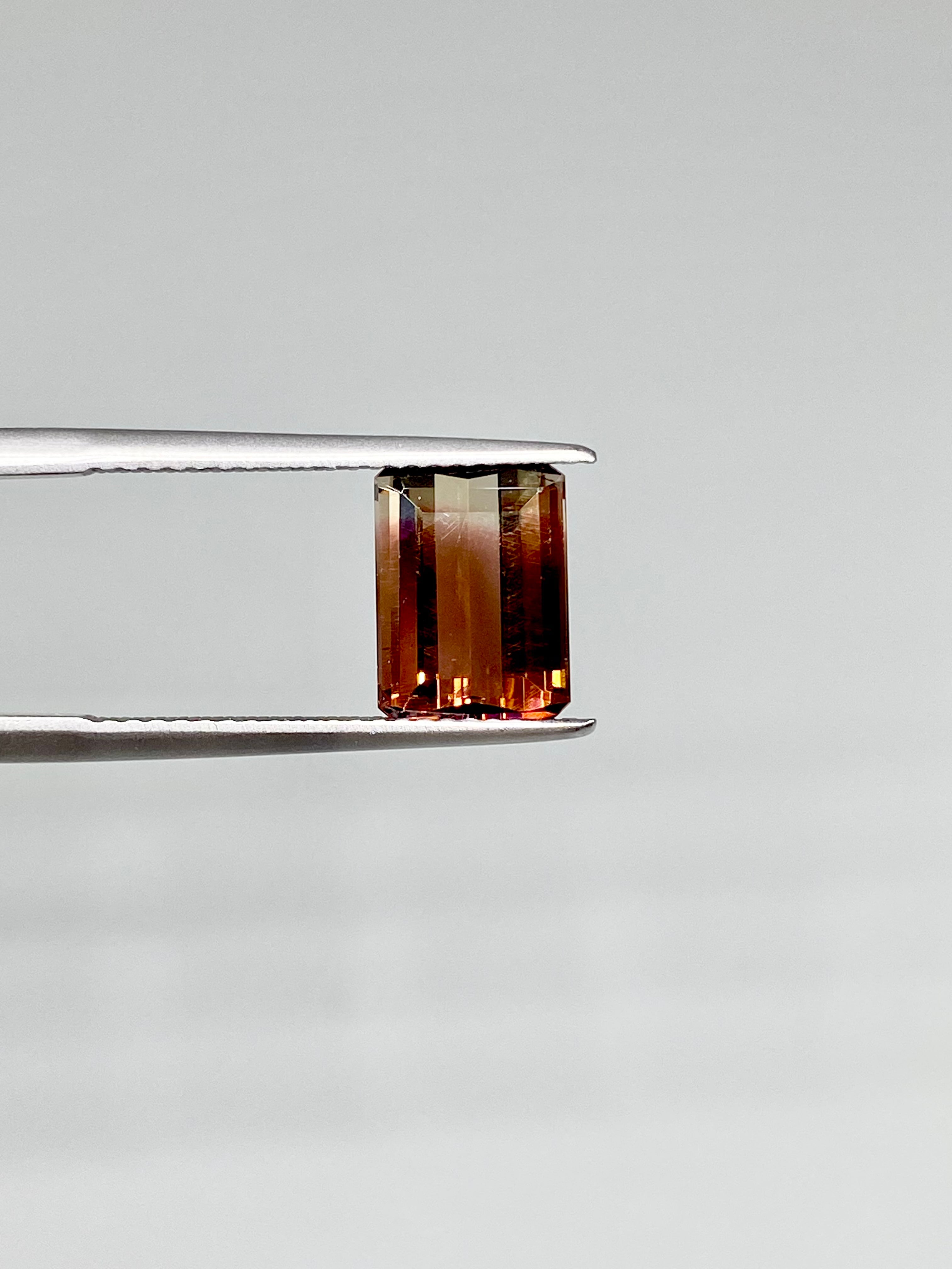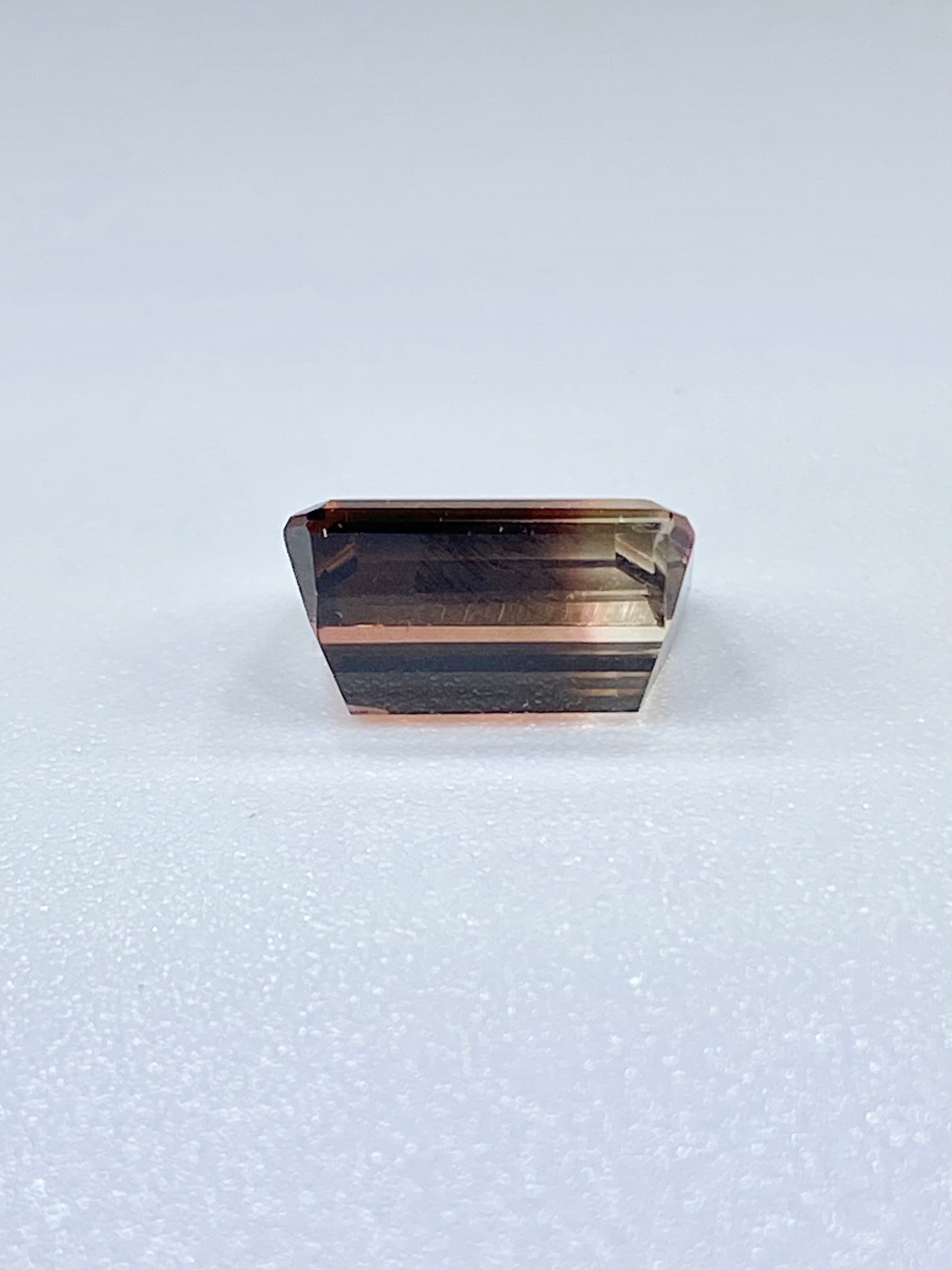 色・輝き:メインの色は一見するとブラウンピンク。光の加減でしっかりとブラウン、加えてパープルのニュアンスが浮かびます。端に薄くブラウンがかった透明部分を持ち、はっきりとしたバイカラーの対比をお楽しみ頂けます。形は角が落とされた長方形で、光が重なり合う、落ち着いた輝きを含んでいます。