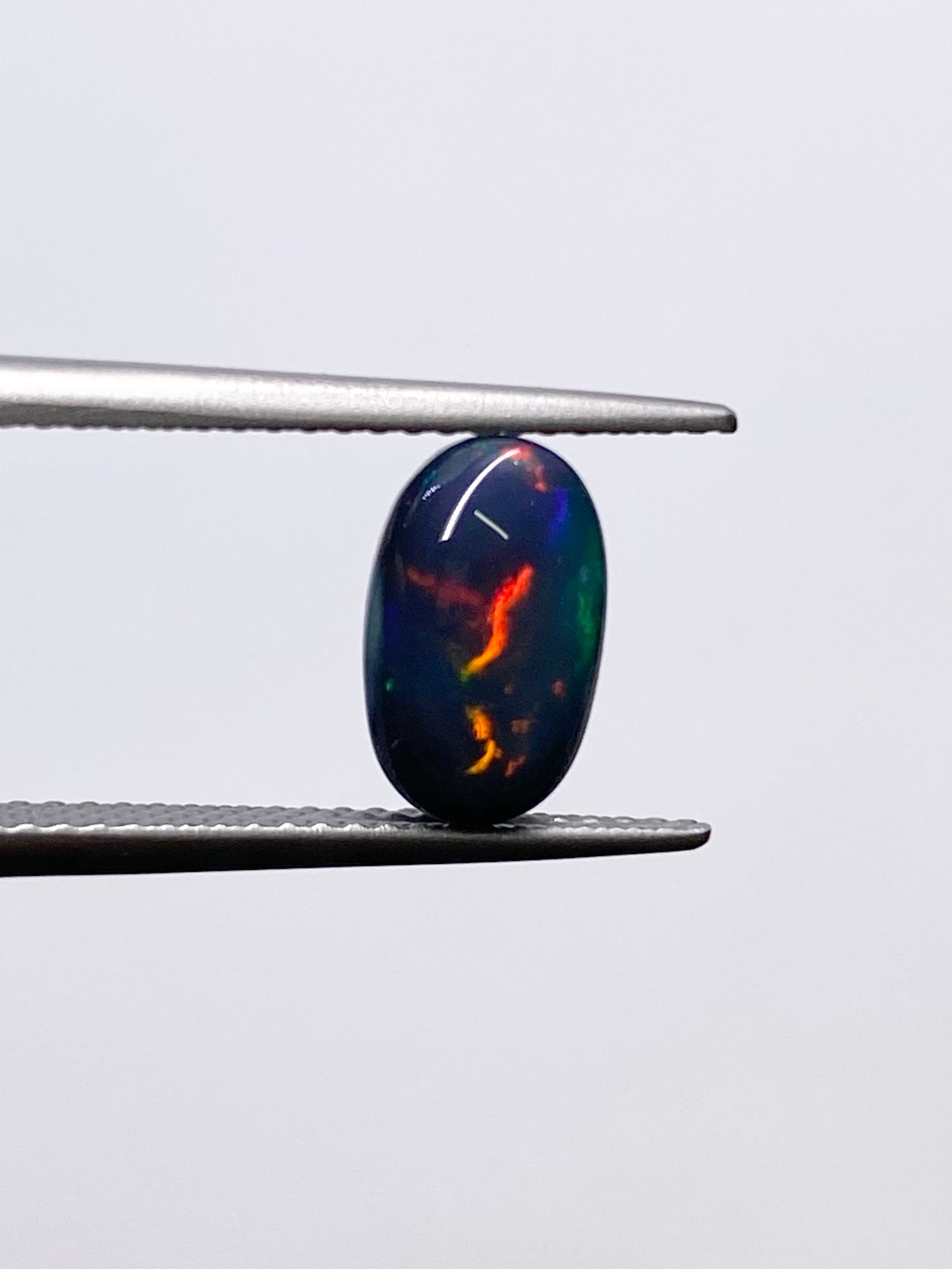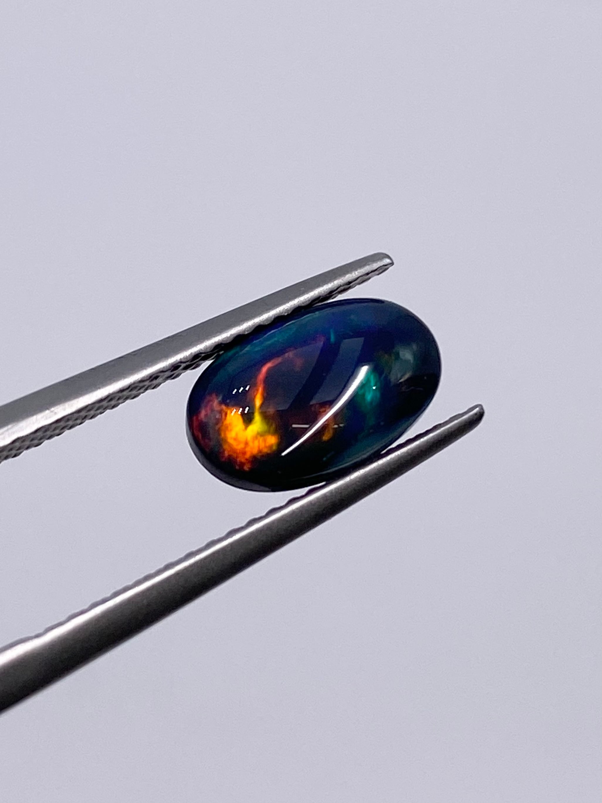 色・輝き:側面付近に一部グレーの部分があるものの、ほぼ全域が漆黒という地色を持ち、その上にオレンジ、レッド、グリーン等の斑が漂うように現れます。地色が暗色のために遊色が際立ち、闇夜に揺らめく炎のような幻想感と格好良さのある外観ですね。