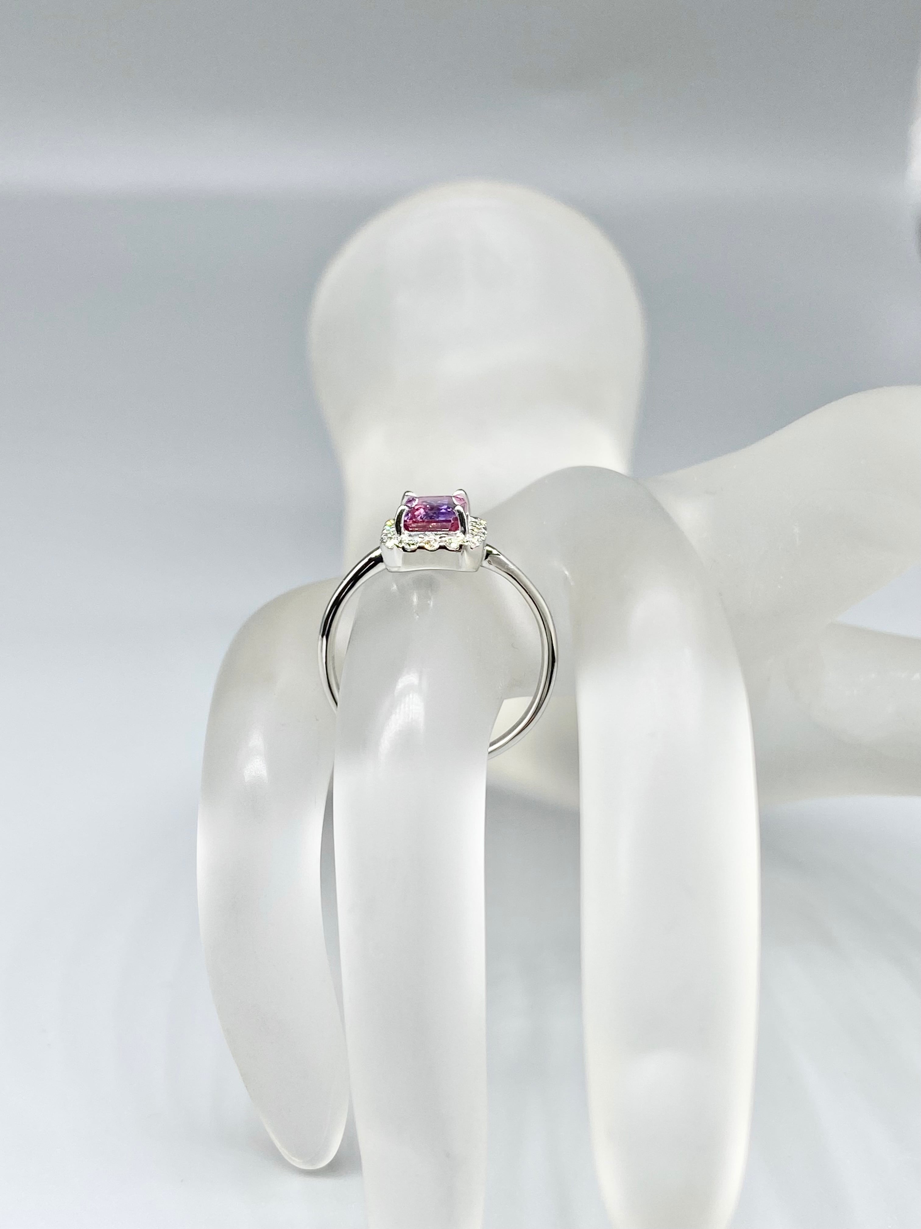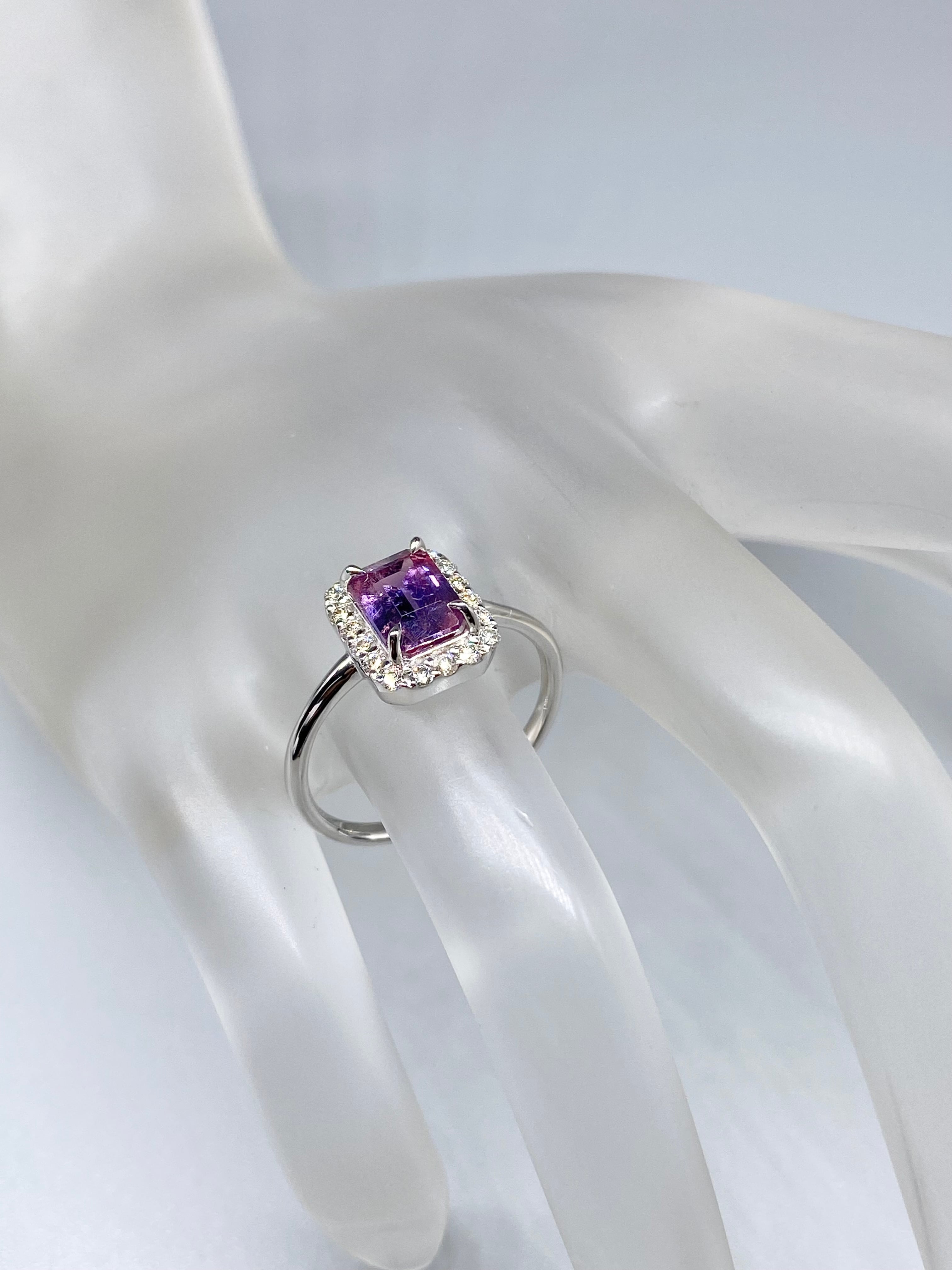 色の境界の部分はバイオレットが若干淡く、ピンクと混ざったような色合い。おとぎ話に出てくる猫のようで、可愛らしさと毒々しさを併せ持つ外観です。また、多色性を持つ石なので、角度を変えるとまた色の雰囲気が変わるところも魅力的ですね。