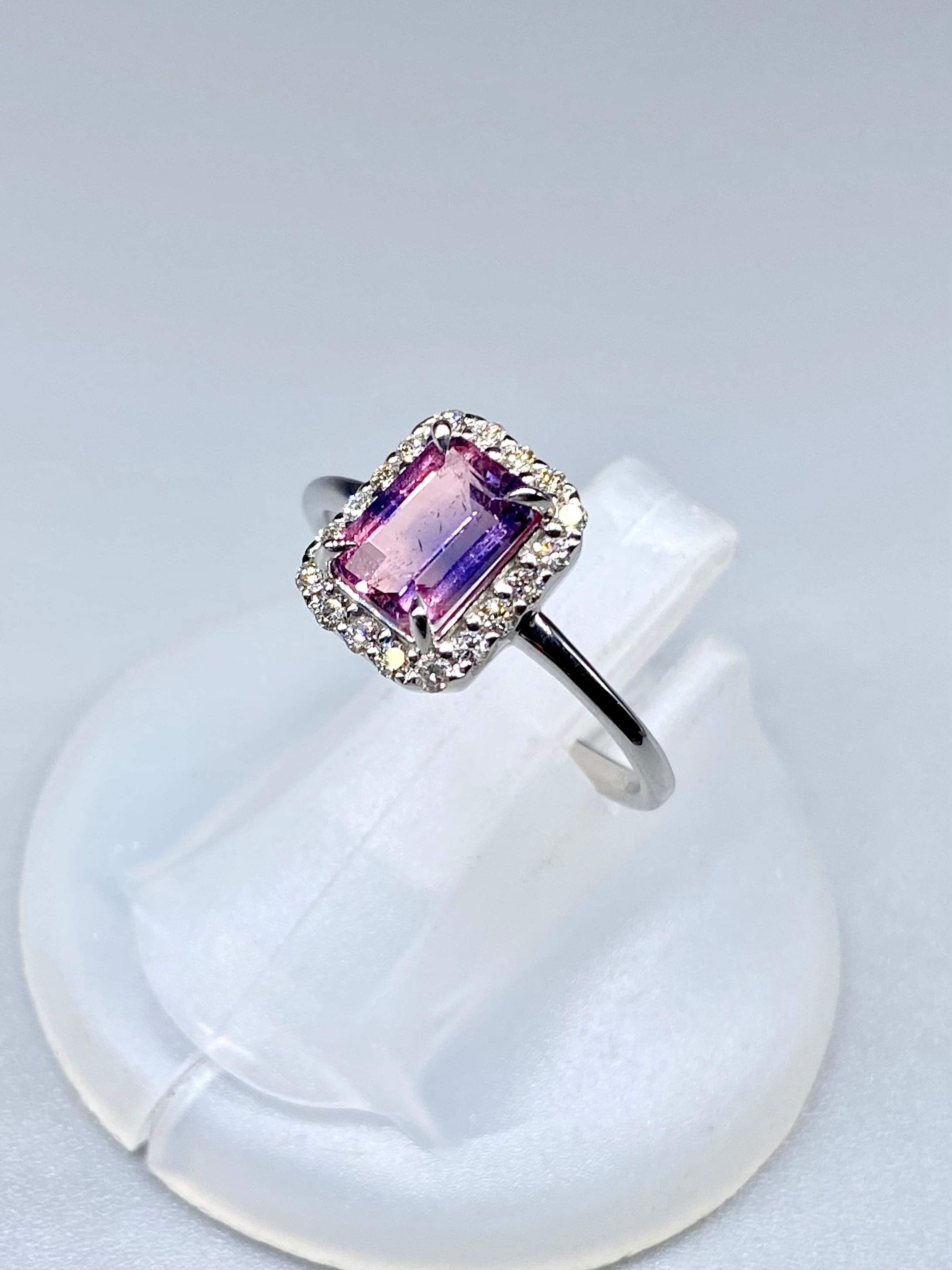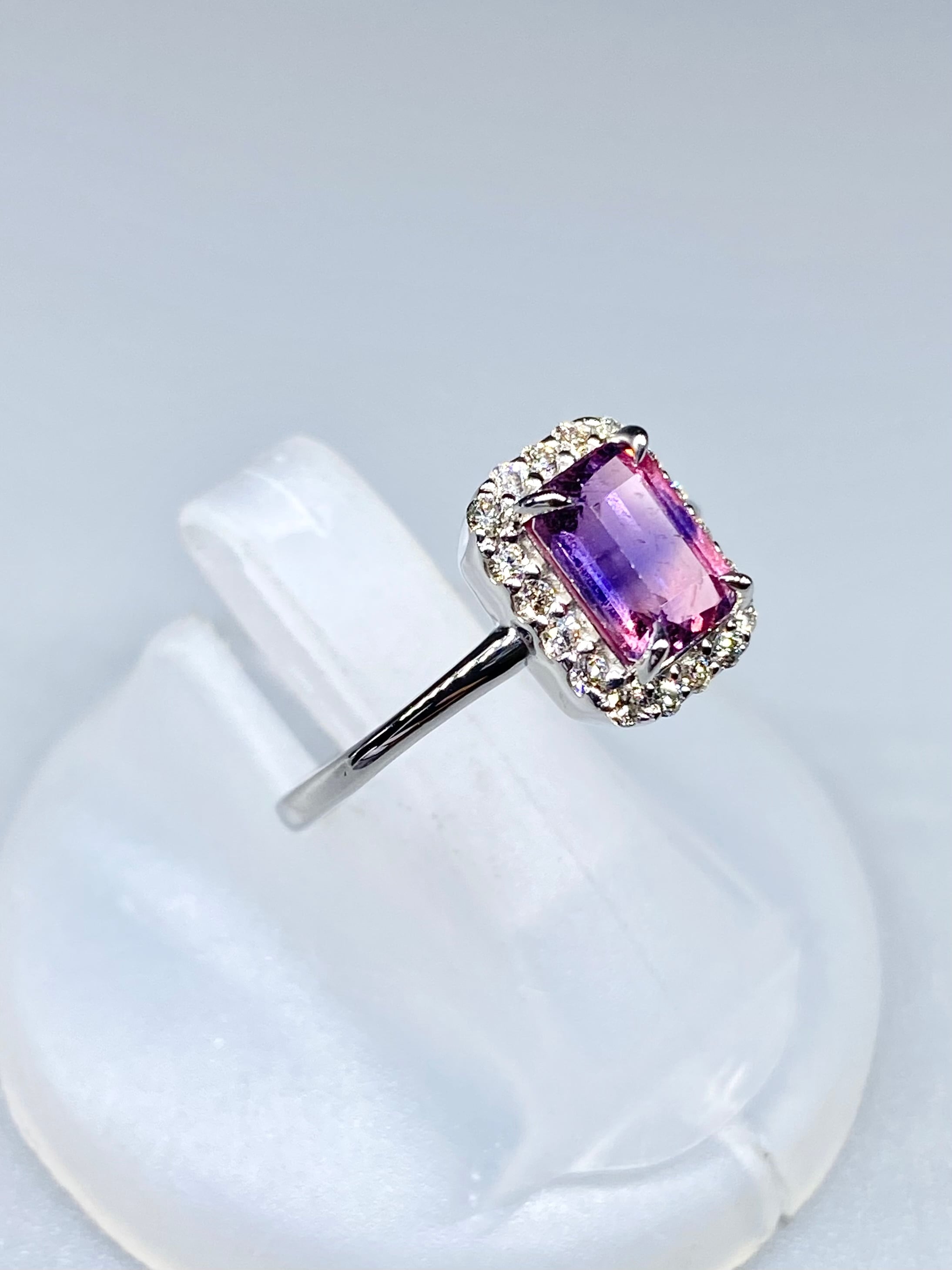 バイオレットはやや黒みを帯びたシックな雰囲気ですが、光が当たるとラベンダーのような鮮やかな紫の輝きを見せてくれます。また、ピンク側は若干オレンジがかったような、ピンクトルマリンに近い色となっており、ビビッドというよりは落ち着いた雰囲気ですね。